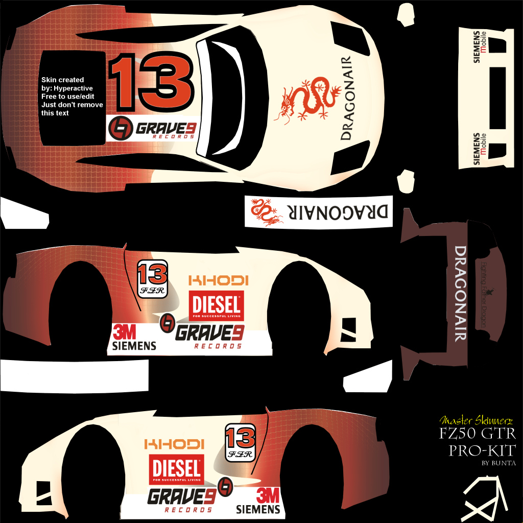 A skin i made for the fz50 gtr. Not made many skins, only probably about 10 - 15 or so. Thinking ive got the hand of it now. The skin isnt based upon any car just made up. Let me know what you guys think, good or bad.