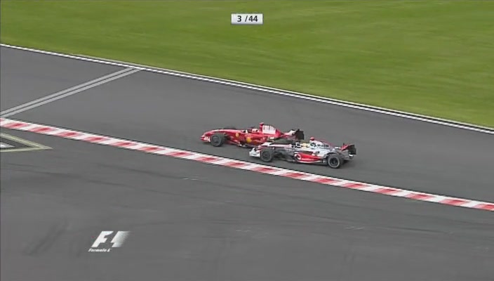 1) hamilton still steering right with very little overlap (front wheel slightly in fron of the ferraris rear wheel) imho barely a nose in and not enough to claim the line