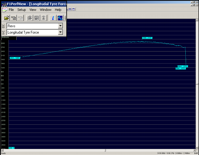 Now, save a replay of this, watch it, and before you cross the finish line, select output RAF data from the menu and enter a file name. Once you have watched yourself reach the rev limiter / crash, you can end the replay, minimise LFS, and open the RAF file in a replay analyser (I've always used F1perfview for this purpose although I don't know if it still works with latest versions of LFS). From here you will need to output the force at the driven wheels, along with engine rpm and throttle, to a text file (csv). This can then be opened in a spreadsheet package. Limit this data to only the region where throttle is 1.0, and perform a little maths* to convert the force at the wheels to engine torque and power.