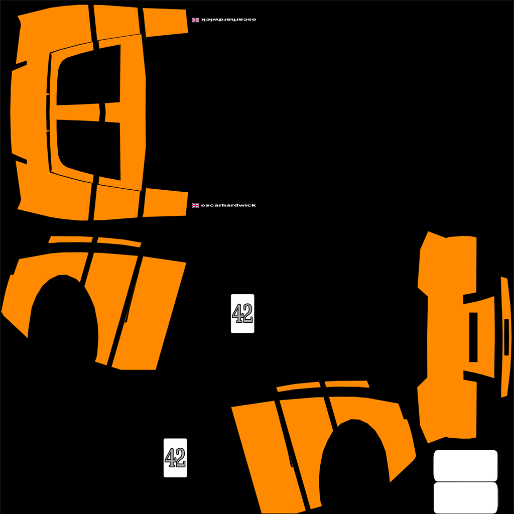 Now, i would like them to take the colour and design of a ktm, the orange and black that is, how you put the orange and black onto the cars is down to your imagination, maybe some whites as well? apart from that no real details apart from, and this can be anywhere, a no. 42 in a no. board, oscarhardwick next to it and on the bonnet somewhere a union jack.