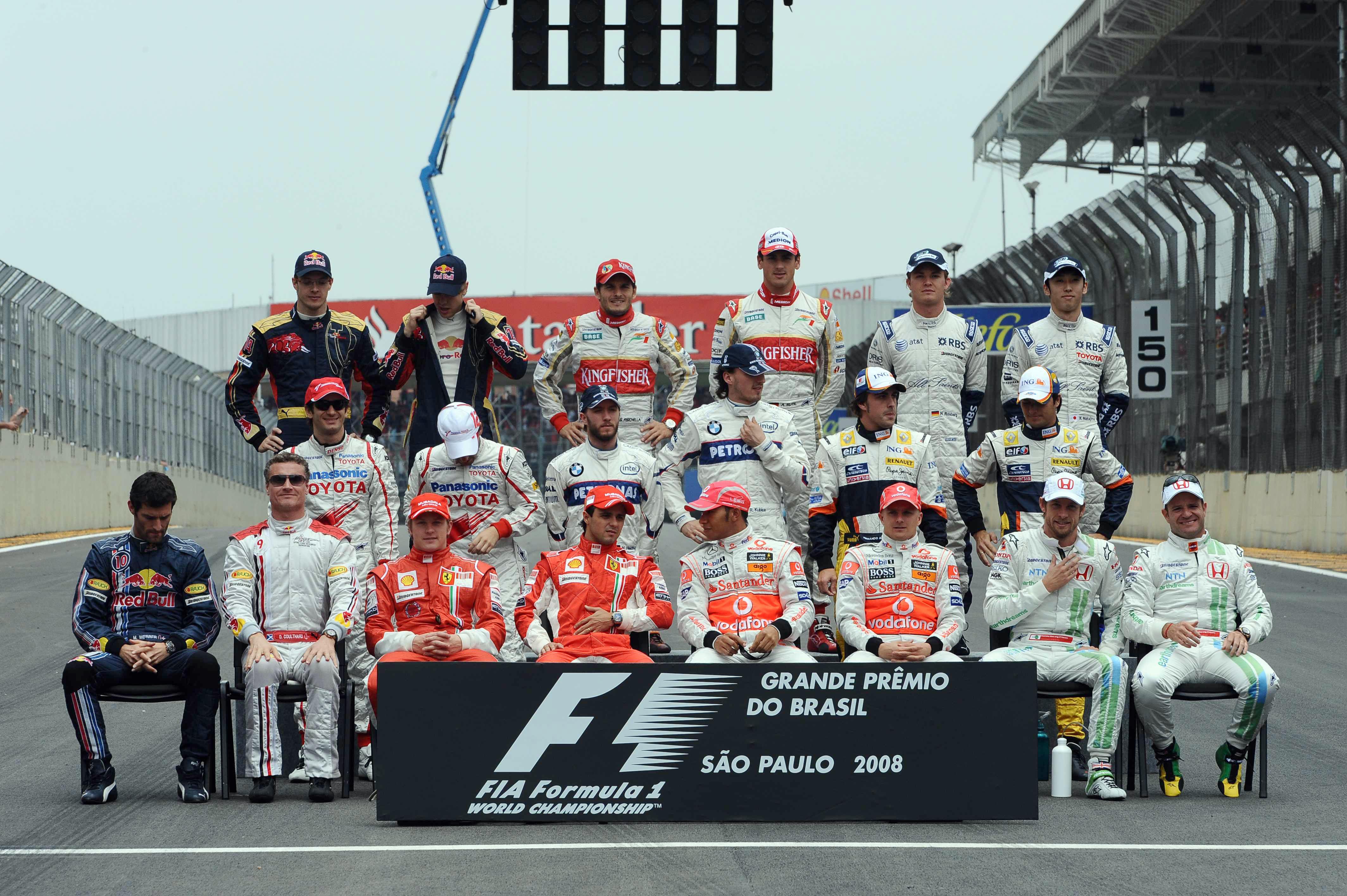 Almost the whole bottom and middle line isn't looking at the camera. Glock looks like he's picking something off of Räikkönen's shoulder, Massa had something bad to eat, Webber is looking at his watch, Vettel is occupied with his jacket...