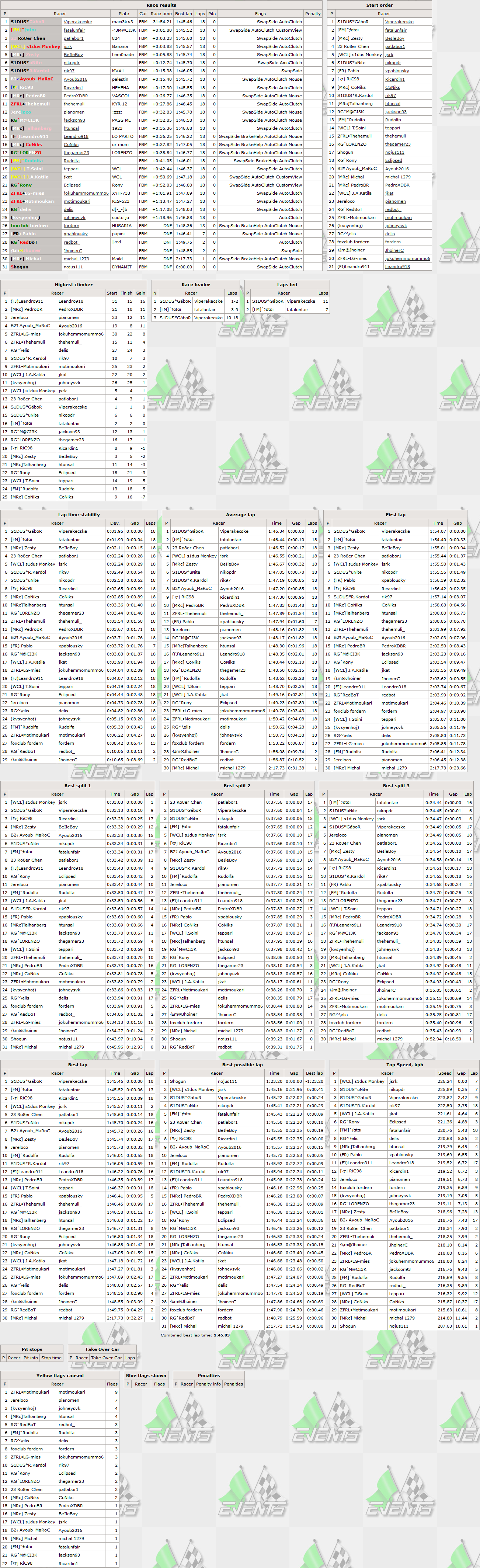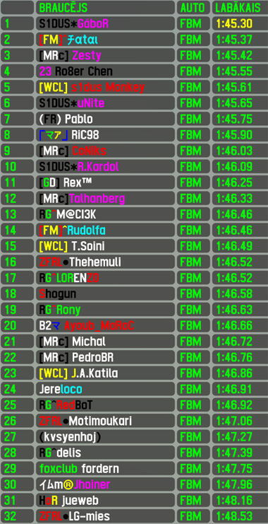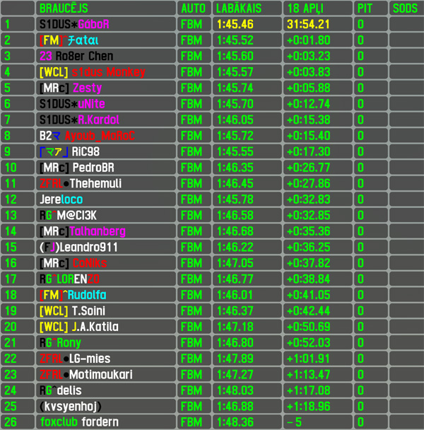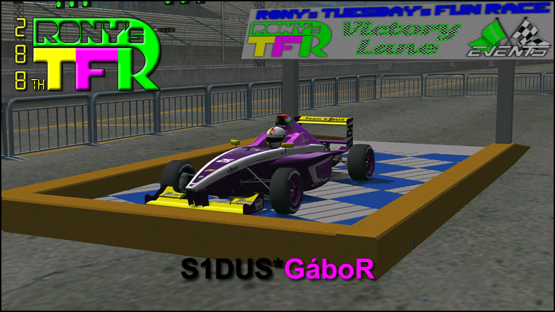 The driver who has won half of the last 12 races stroke once again this week - Gábor set the fastest lap in both sessions and crossed the finish line ahead of competition after leading 11 of 18 racelaps. After scoring his 11th pole position and during race picking up also his 11th fastest lap of the race,he scored also his 16th RTFR race win - Gábor is only the second driver to win more than 15,aditionally it was his 29th top5 finish and 22nd win for Hungary,tying Lithuania for 3rd most wins in nations success chart. Despite leading 7 laps,Fatal eventually got cought with group effort and with it lost the lead of the race,which he could not regain anymore,2nd place finish for the previous 2-time racewinner and 16th top5 finish. Well known single seaters driver Ro8er Chan joined RTFR for the first time and proved his skills to finish 3rd,closely followed by WCL's biggest bananas consumer,who also scored his 16th top5 finish. Top5 was closed by Malaysian driver Zesty,who scored his 2nd top5 finish out of 5 total finishes.