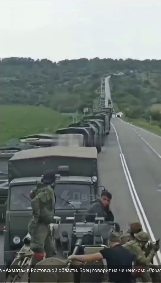 A huge convoy of military vehicles of Akhmat troops stands at the entrance to Rostov, (pic 1) which is now occupied by the Wagner PMC. Big fights are expected for the city, people are piled up at the train stations and at the exits from the city.