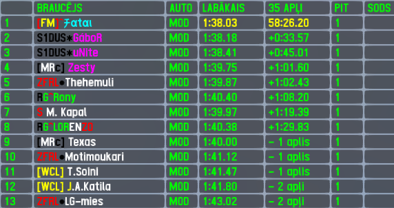 Last year's second best driver was the one to beat this year in round one - Fatal set a track record during practice before the event,even if he could not get close to it in qualifying,he still was the fastest and the only one beating 1:38 mark. But it must have been race start stress as he made mistake on lap one and gave up the lead,but regained it after the temporary leader also made a mistake - the finn led the remaining 33 laps to become the 1st winner with turbocharged car in this league,scoring his 2nd VERL race win. The defending champion Gábor did not do as much practice as the racewinner,that might be the reason of his performance - he made several mistakes and finished over half a second behind,settling just for 2nd place finish. His teammate Unite finished 3rd and was one of 3 drivers with positions gain during race.