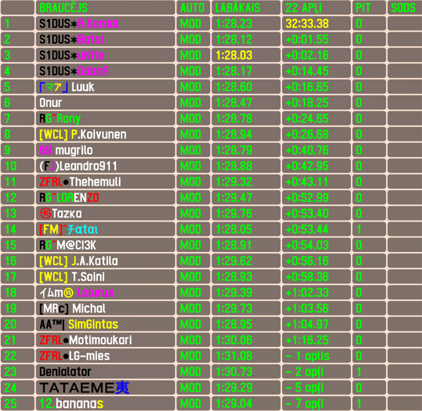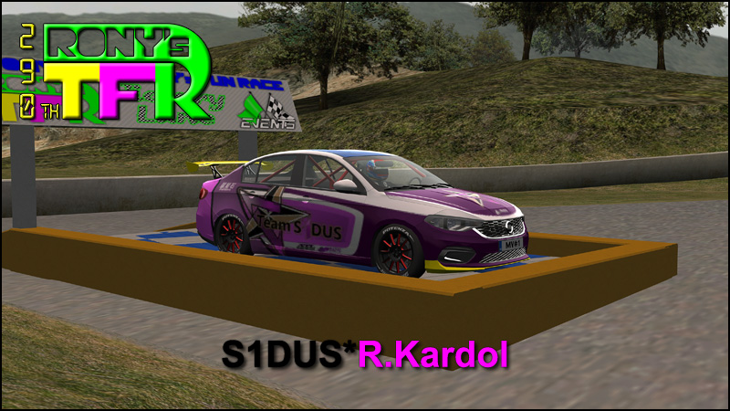 R.Kardol started the race from 3rd position,but slipped into 2nd position right after start as the polesitter had his problems. After chasing hard his teammate for 2 and a half laps,the dutchman found a way past him to slip in lead - that was the last lead change in the race as the 13-time RTFR racewinner turned himself into 14-time racewinner by leading the last 20 laps,scoring also his 62nd top5 finish. The most successful driver in RTFR history Botsi started from front row and took over the lead soon after green lights,but could not keep it for long and never really got close enough to endanger his teammate's win chances - 2nd place finish for the finn is his 66th top5 finish,still 2nd best in this chart. Unite finished 3rd scoring his 64th top5 finish,setting fastest lap of the race during his chase of leaders which he never caught,that's his 23rd fastest lap,securing his 2nd position in the according chart even more. The all-S1dus top4 was closed by Gábor,who saw his winning streak end yesterday,scoring his 31st top5 finish. Best of the rest was Luuk,who unlike all other top5 finishers never had much success in RTFR - his 9th position in qualifying is an improvement by 2 positions from his previous best of 10 tries,while 5th place finish is a huge improvement from 18th position,which was the better of his 2 previous finishes here. One more driver has to be mentioned here - Fatal set the currently known best laptime of the combo during qualifying scoring his 3rd pole position,but had few too many adventures during the race and finished just 14th.