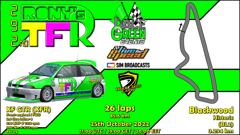 Next week is the speed week as RGE will offer 2 events running high average speeds - on monday VERL 2022 round 4 in Aston National will be the fastest round of the 5 round season,which might bring some decisions for the championships. Still new entries possible,everyone can still enter themselves in league history books as competition for current leader is needed - info and signups in VERL forum section. Tuesday is RTFR day and next week it's time for the XL version,which will feature the fastest LFS original car BF1. The venue however will reduce the speeds - South City's longest configuration is a very tricky concrete canyon. But in 2 weeks next RTFR will bring something slightly different - some information was given out in the stream,additionally we can reveal that the track is for next race was tried to be made as autentic as possible for the specific car,more details as always on the weekend before the event.