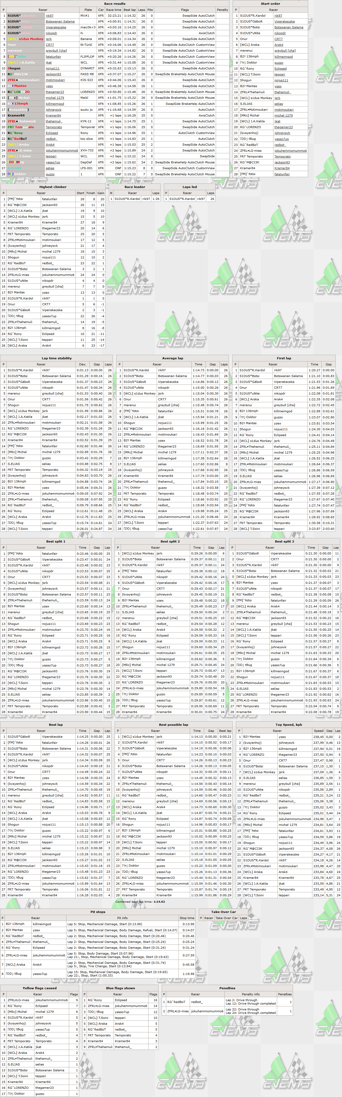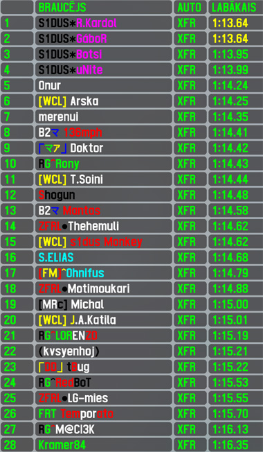 The last year's champion was on top of the game in this edition of RTFR - R.Kardol's time was tied in qualifying,but just like in LFS's WR standings,the 1st to set best time counts as the fastest,therefor the dutchman scores his 12th pole position in the event,tying Gábor (who tied the laptime) and Litro for 4th most pole positions in RTFR history. By leading all 26 laps,R.Kardol did not see much of competition even if the closest rival was gettting bigger in his mirror in last 1/3 of the race,so he tied another big value in RTFR history - 15 wins (3rd most together with Agent and Merenui,the latter also was attending this race),scoring also his 64th top5 finish. Botsi started 3rd,gained a position soon and finished 2nd just like 4 weeks ago on his previous visit after longer break - 67th top5 finish for him,still 2nd most. Current season standings leader Gábor lost that position to his teammate and finished 3rd to score his 33rd top5 finish,while chasing the leaders he set the fastest lap of the race,his 13th,tying Agent and Fast for 3rd most of those. Current 10 race racing leader Unite closed the S1dus row of drivers with 4th place finish,scoring his 66th top5 finish. Top5 was closed by driver from other team,but still having "S1dus" in his name - a monkey representing the sponsoring team WCL scored his 17th top5 finish here.