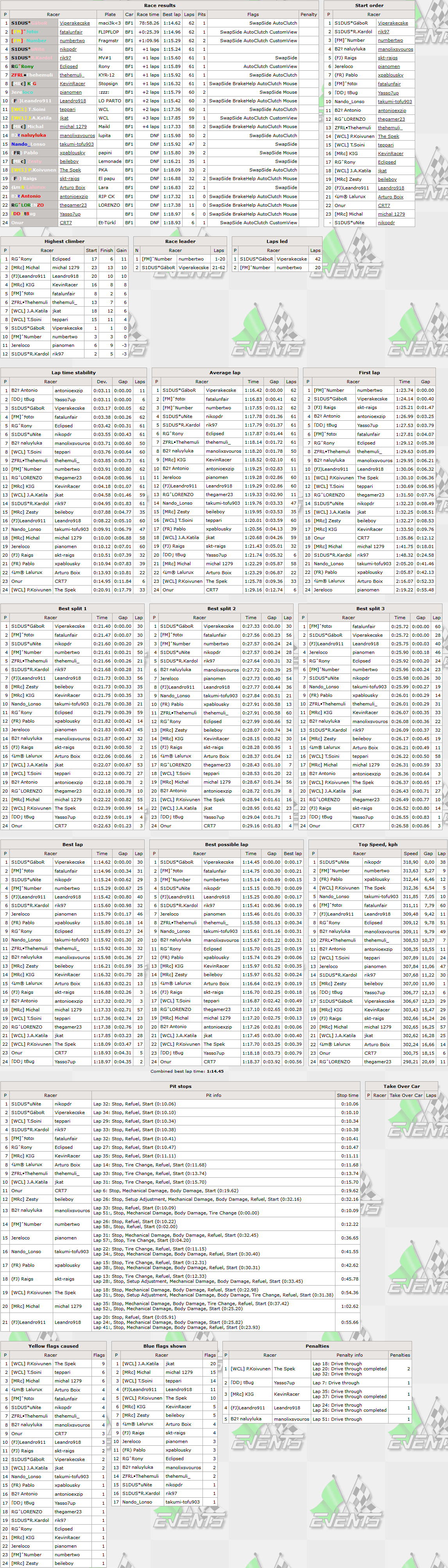 With full fuel tank the BF1 could complete just around 35 laps from 62,so technically no clock pitters by default rules. Still even full refill requires less than 10 seconds for this car,so few drivers still needed to wait after pitwork was finished - Unite had the shortest pitstop from everyone with his 10.06 seconds pitstop.