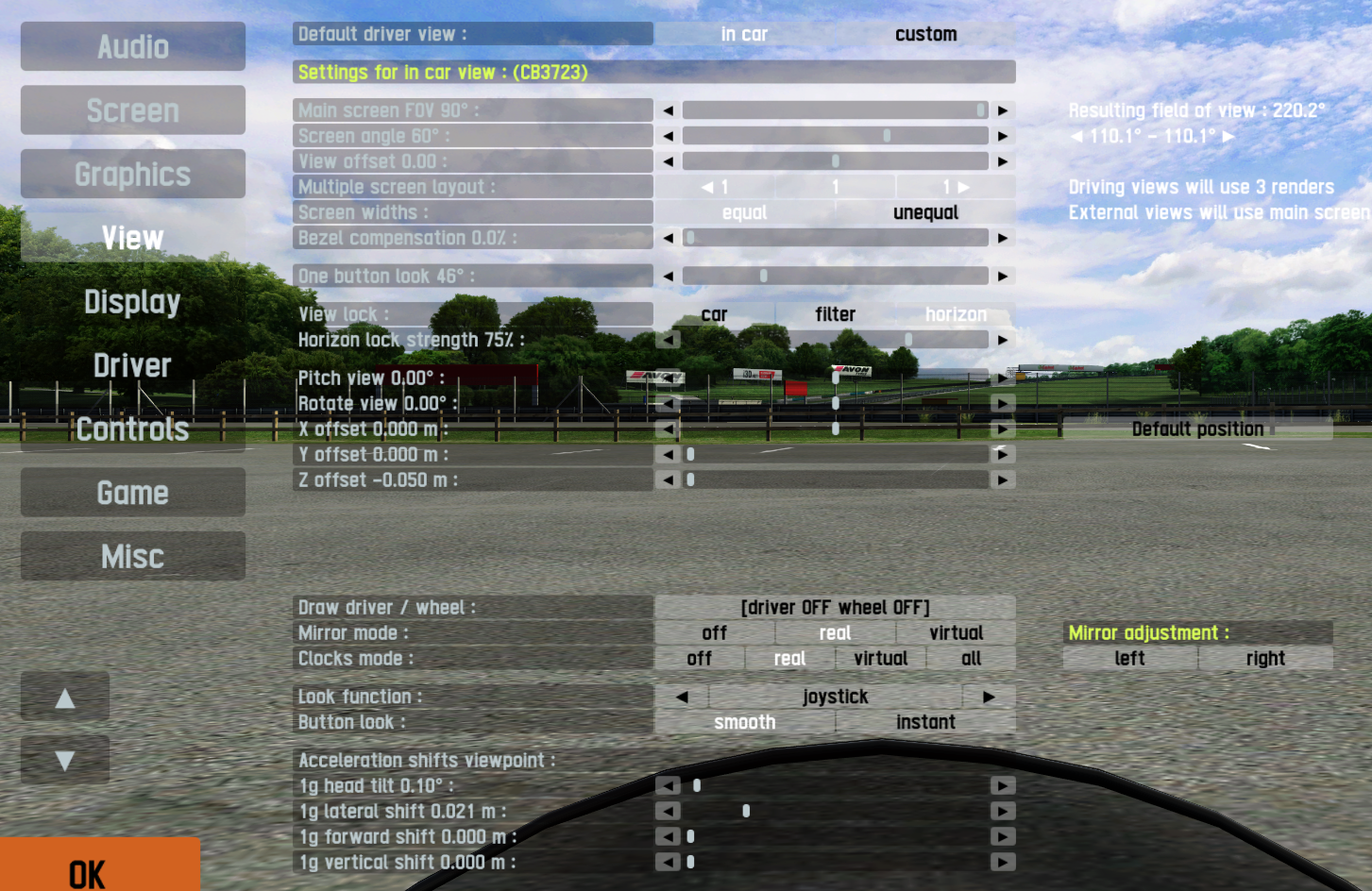 I was just wondering; can we separate the views for cars now? I like the horizon lock on bikes, but I don't like it that much in cars. And I can't always position the driver enough backwards to get the cockpit in view a bit with the speedo. Like with the FoV slider, seems like all vehicles are in the same type of view.