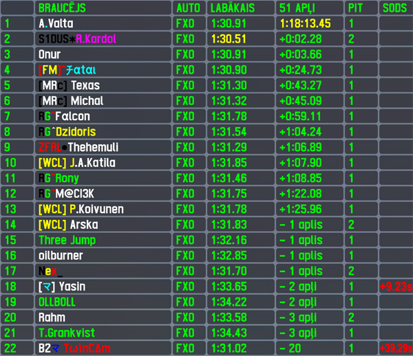 The AWS 2023 standings leader A.Valta was not much seen on the broadcast as he was slowly losing sight to leader during the race while running 2nd,but the with the drama for race leader he just simply took over race lead on last lap and finished 1st to win his debut race in RTFR XL. Since he has chosen to hide his stats in LFSW,the win will be not awarded to any country (goes to "other"). After the finger biting mistake in pitlane,the leader of race's 50 laps R.Kardol rescued 2nd place,scoring his 8th pole position,10th fastest lap of the race and 35th top5 finish,but missed the chance to tie Botsi for all time most wins. Onur started 3rd and finished 3rd - that is his 2nd entry in top5,which is 2 positions better than his 1st entry. Fatal lost a lot of positions in 1st lap,did his mandatory pitstop right after it,rest of the race was just regaining positions to finish 4th - that's the 12th top5 finish for the 2022 RTFR XL standings winner. Texas closed the top5 by scoring his 5th top5 finish,that's his 1st one since 36th RTFR XL