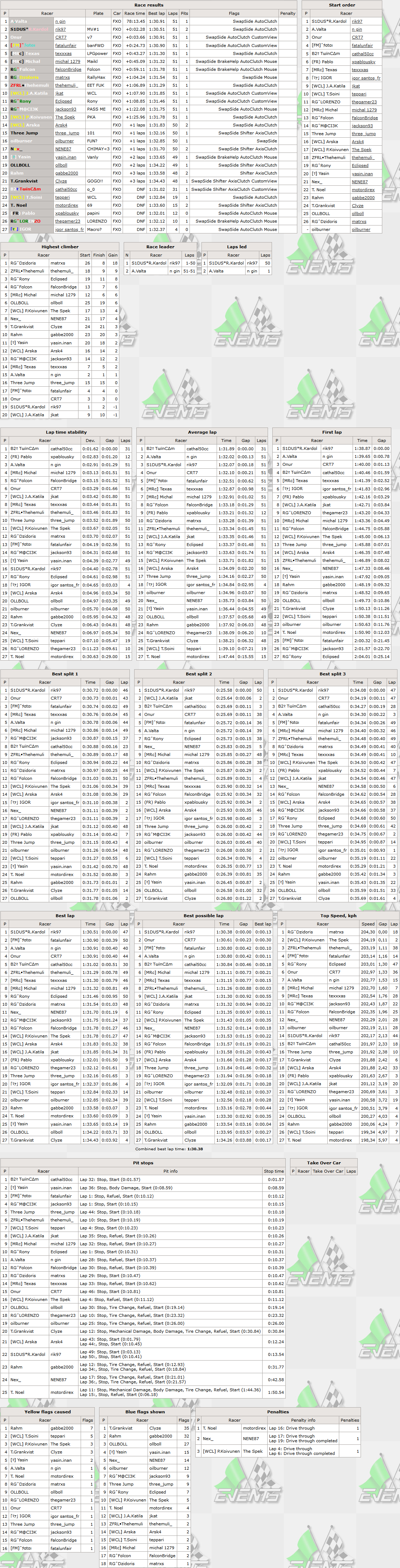 A very interesting coincident happened during the last 2 Race Green Events hosted races - in both AWS 2023 round 4 on monday and the 73rd RTFR XL on tuesday the race was won by a first time participant in the respective event series and both winners did so by leading just a single lap - the last one! If on monday that happened from race situation and the way how bumpdrafting in high speed oval works,then tuesday's situation was caused solely by actual leader's double mistake - first he did a too short pitstop,then the repeated pitstop was too long allowing the rival pass by - the 2nd pitstop was 3.5 seconds longer than required minimum and the race was lost by 2.2 seconds. Also this race saw the biggest attendance since 67th RTFR XL,which also gathered up 30 drivers in it's qualifying session.