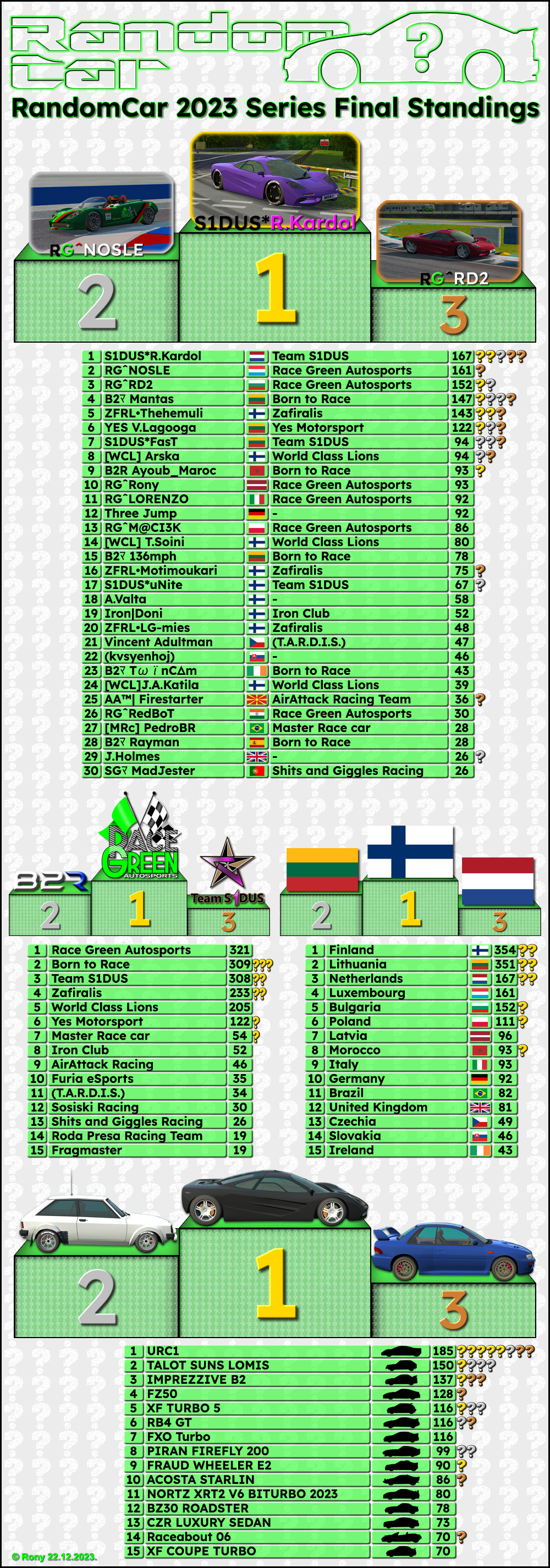 • RandomCar Nations Champion - awarded to a nation with the most points scored through all 10 rounds (nation will score finishing points from it's 2 highest finished drivers and all round bonus points)