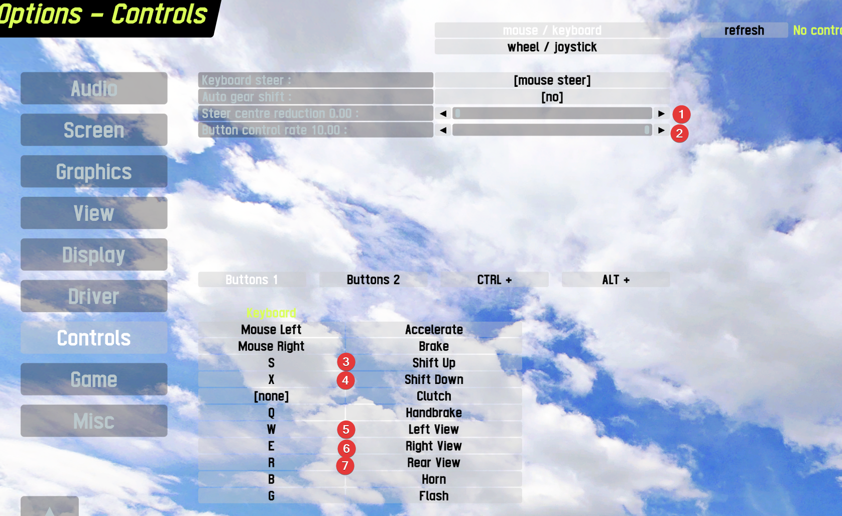 Then u may see an another important parameter related to steering in Options-Misc called "Analogue steer smooth", this one goes to 0 of course. Some people say that even ffb strength setting can affect the mouse steering too, so u may want to play with "."-more force and ","-less force parameters which could be set online when driving on track. Button binds and etc are personal preferencies, but classic LMB-throttle RMB-brake is just fine.