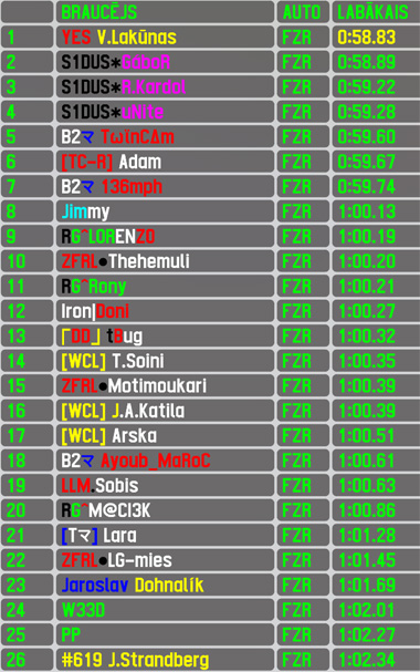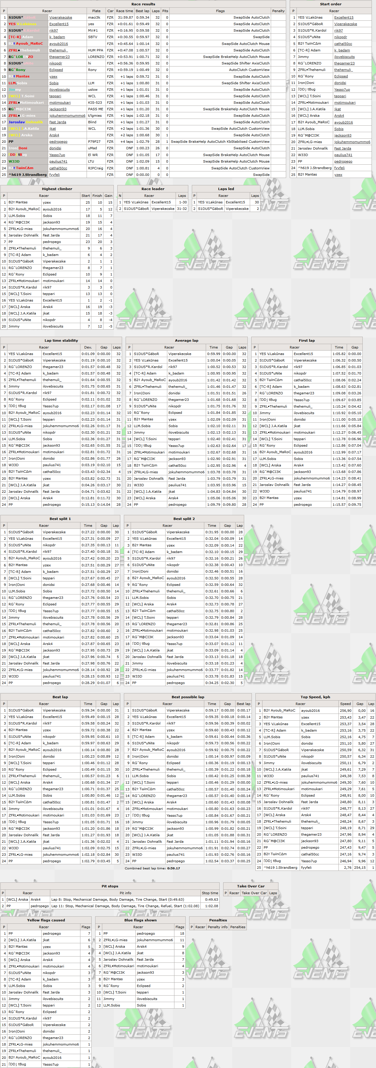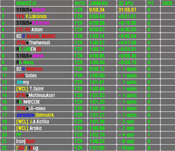It's not really clear why the lead change happened,but with less than 3 laps to go Gábor took over the race lead after being in chasing position for almost whole race,led the remaining 2 laps to score his "Black Jack" race win - the 21st RTFR victory. While running in lead,he also set the fastest lap of the race,which was his 16th,adding also his 45th top5 finish to stats. The lithuanian driver with ever changing name was the one to beat in qualifying,so he scored his 17th pole position,but after leading 30 laps,he lost race lead and finished 2nd to score also his 17th top5 finish. R.Kardol was rather invisible on the broadcast as he was running alone for most of the race,finishing 3rd,which is his 75th top5 finish,Adam had way more action to go through to finish 4th and in top5 for the 4th time. Ayoub Maroc used the chaos in late race stages to slip into 5th position,scoring his 9th top5 finish.
