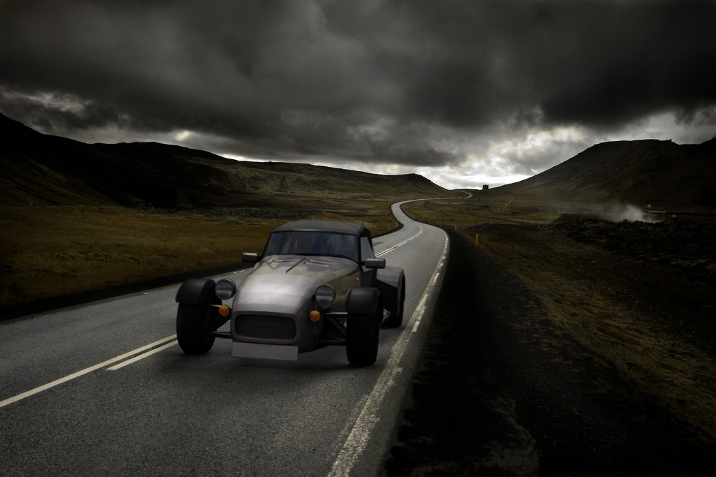 looks nice! but i realy don't like the material of the headlamps and material of the roof(i know this is the original, but i think you tried to make the scene "real")! try to add a leather shader to it or maybe try to make it convertible...