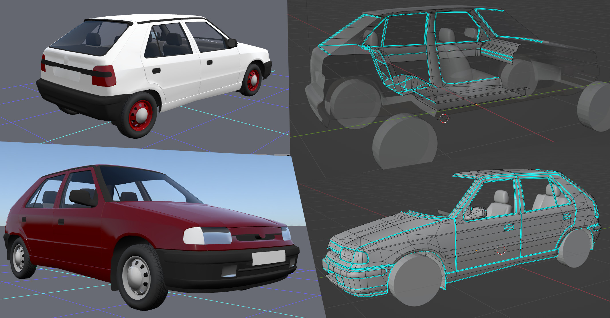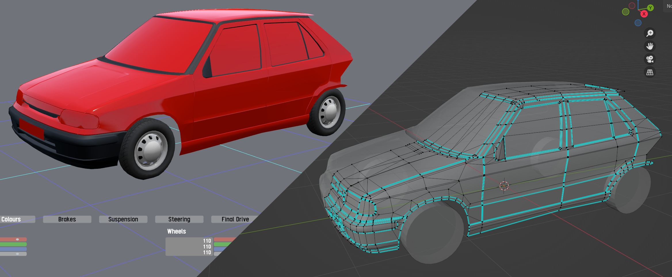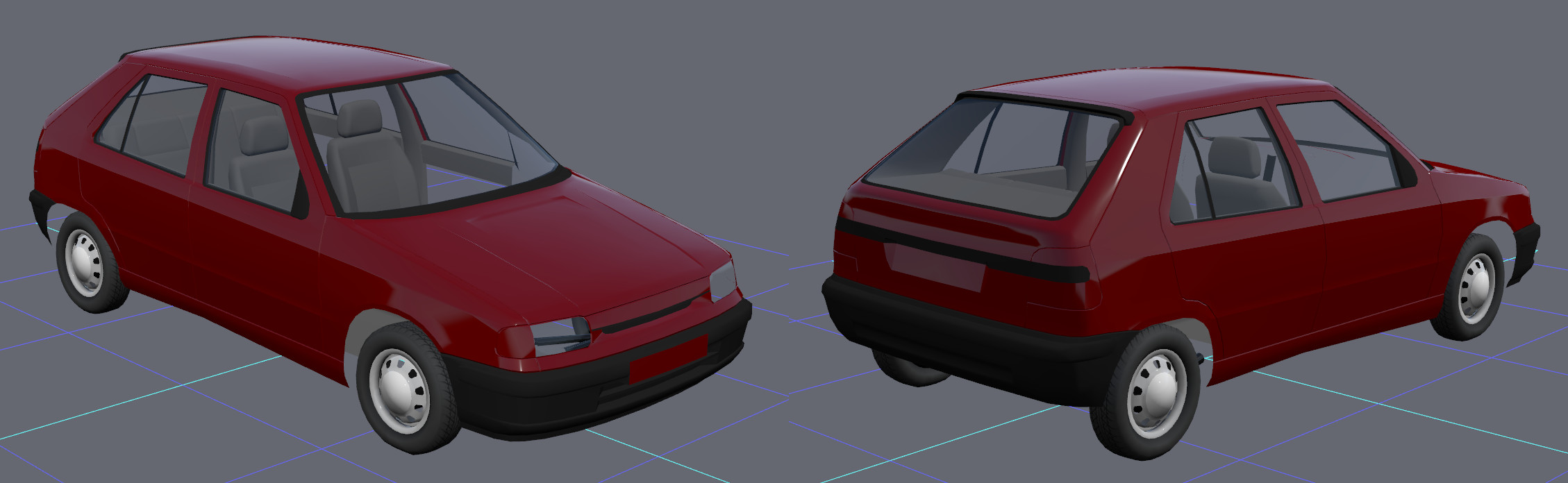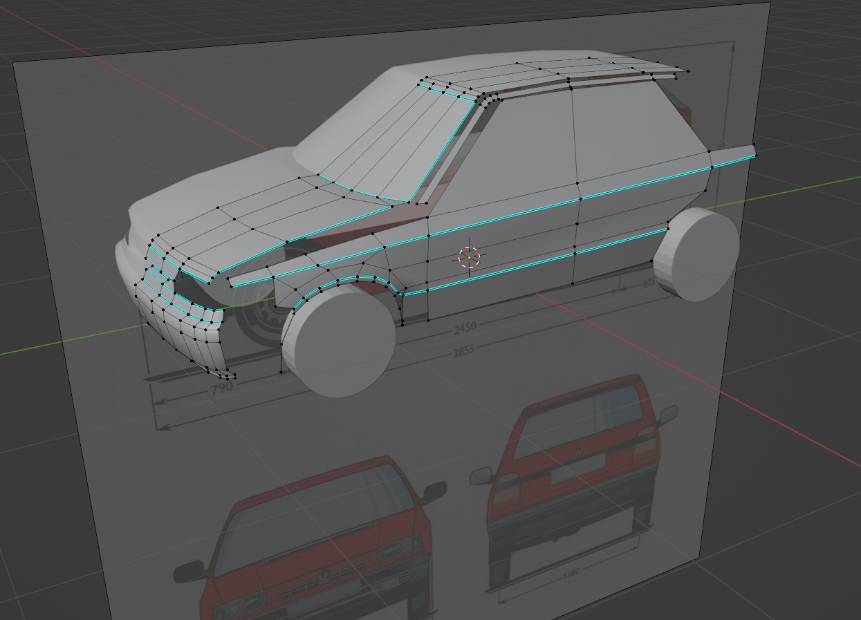 Progress: tuned wheel alignment and suspension travel according to the service manual, added a realistic center of gravity, completed physics (except dampers, where a more accurate linear approximation is needed to fit values obtained from the service manual). Started modeling the rear. The first test-drive feels surprisingly realistic. The front bumper almost buried itself to the ground and the outer rear wheel lifted above the surface during a sharp cornering. The real car did the same thing, when going too fast through a roundabout (the slower versions did not have an anti-roll bar).