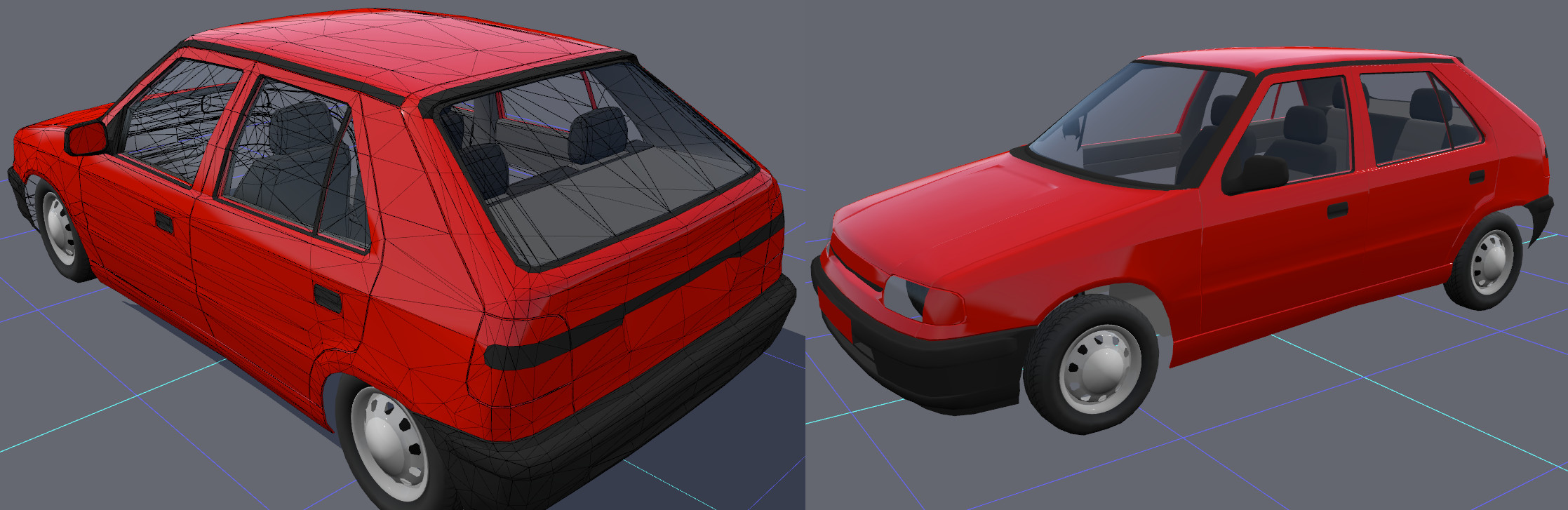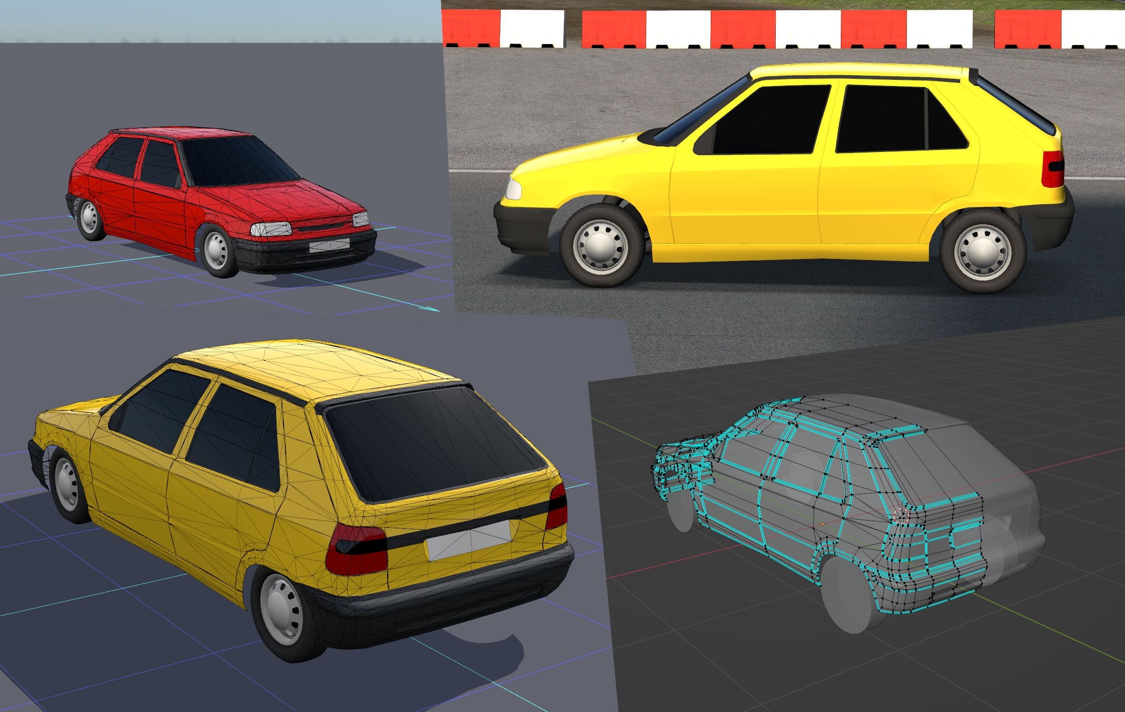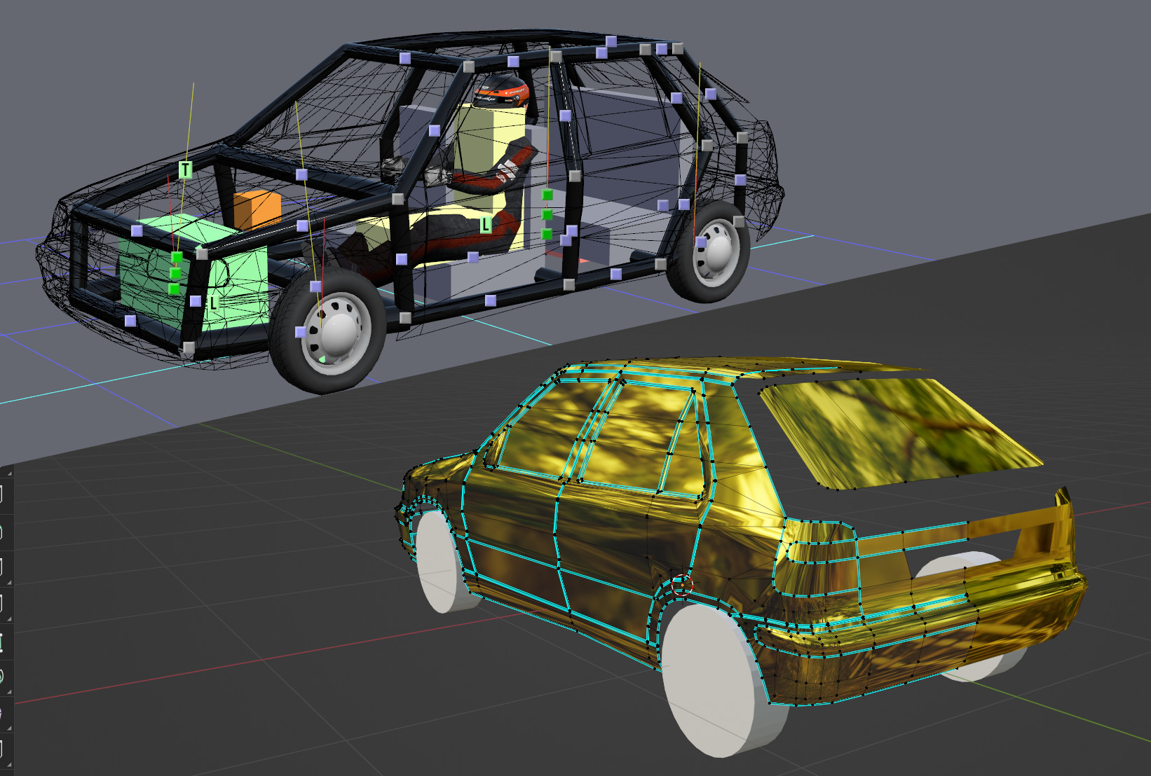 Progress: tuned wheel alignment and suspension travel according to the service manual, added a realistic center of gravity, completed physics (except dampers, where a more accurate linear approximation is needed to fit values obtained from the service manual). Started modeling the rear. The first test-drive feels surprisingly realistic. The front bumper almost buried itself to the ground and the outer rear wheel lifted above the surface during a sharp cornering. The real car did the same thing, when going too fast through a roundabout (the slower versions did not have an anti-roll bar).
