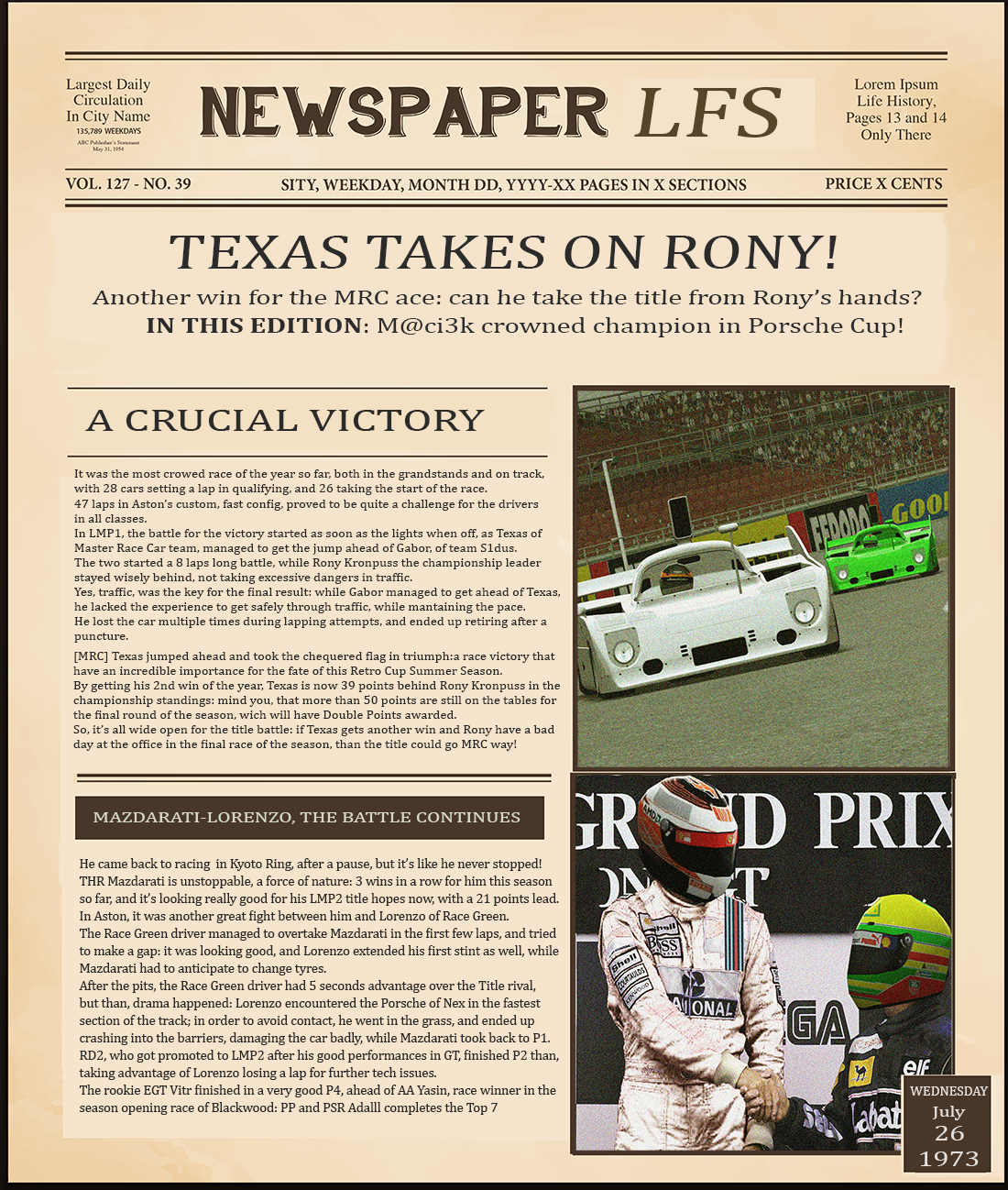 I like how you picked a race overall which is matching the car livery for the newspaper Smile