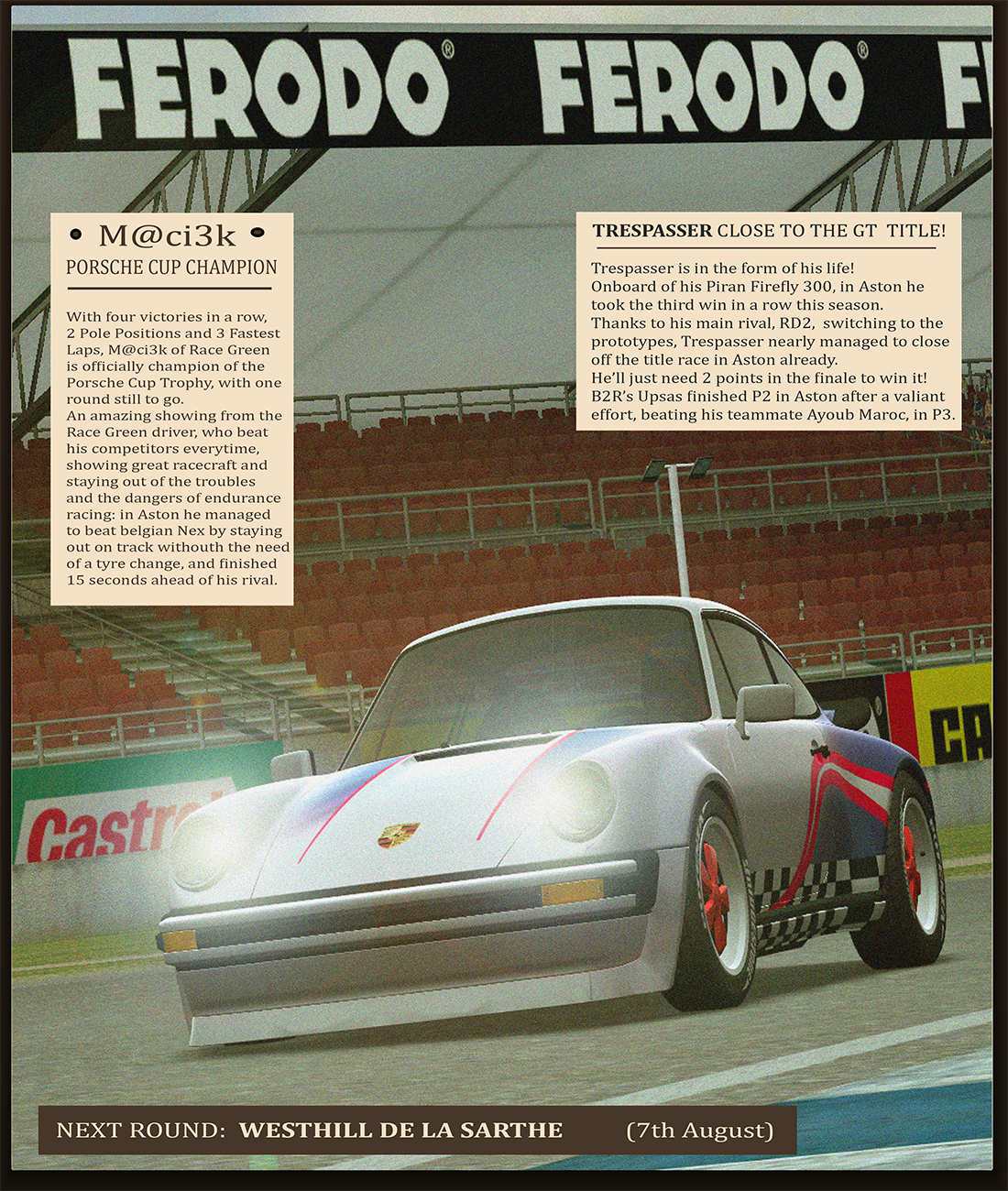 Porsche Supercup was closely contested this time around, with belgian Nex & RG Mandula fighting hard in the first stint, while champ leader M@ci3k was following closely, from 3rd.