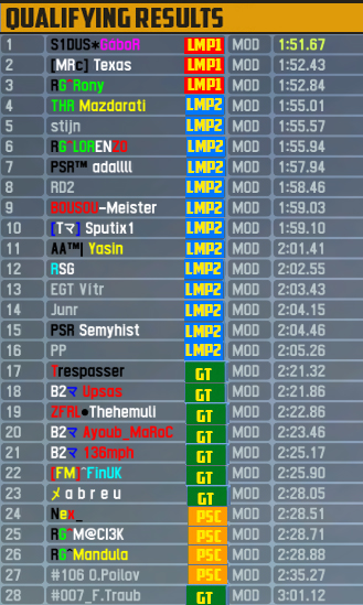 - LMP2 classification is led by THR MAZDARATI, slightly ahead of RG^Lorenzo, AA Yasin & [MRC] Talhanberg