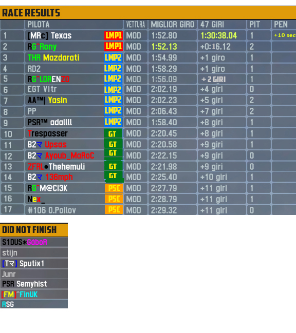 In LMP2, it was THR Mazdarati who took another great win, beating @RD2 who levelled up from the GT car he was using in the previous rounds. Podium is completed by RG's Lorenzo, who was in the lead before an incident with belgian Nex, while in traffic.