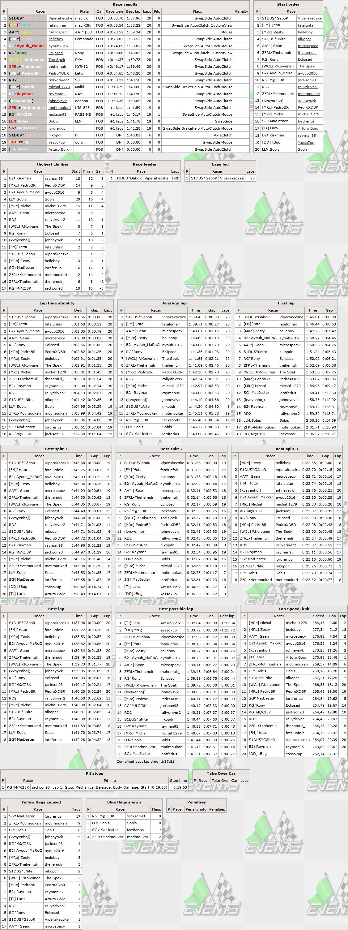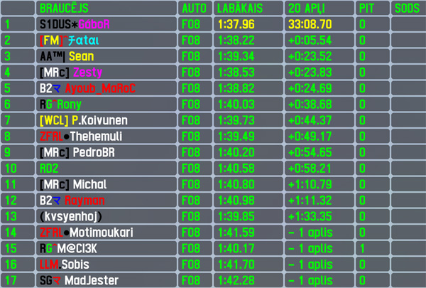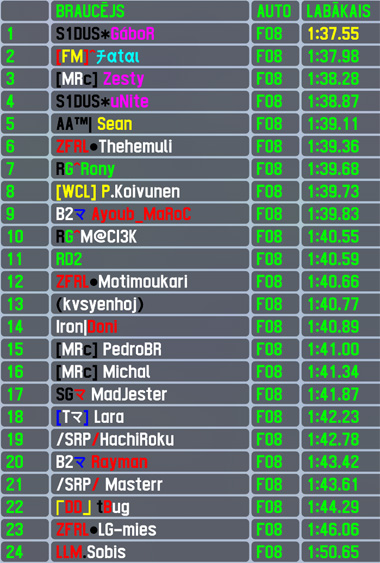 The last VERL Formula V8 champion Gábor was on the heights of duty once again,outqualifying the competition by 0.4 seconds and scoring his 16th pole position in RTFR. He led all 20 laps on the way to victory lane,clinching his 23rd RTFR racewin and on the final lap securing also fastest lap of the race - his 18th. The hungarian has now a total of 48 top5 finishes and lead in 2023 season 2 standings after first of 10 rounds. The defending VERL champion (the one who won series with new car) proved himself being a worthy FO8 driver too being the only driver having the winner on visibility range whole race long,finishing with 5.5 seconds gap. That was Fatal's 20th top5 finish. The late race semi-distant 3-way battle for 3nd place was won by Sean,who scored his highest RTFR finish (improvement by a single positon) and 3rd top5 finish. Despite running most of the race 3rd,Zesty threw the chance for his best RTFR finish away on his own,eventually rescuing 4th place finish to have the complete repeat of his best achievements yesterday - 3rd in qualifying and 4th in race,adding 3rd top5 finish to his list. Ayoub Maroc completed the top5,scoring his 10th top5 finish in his 30th overall finish.