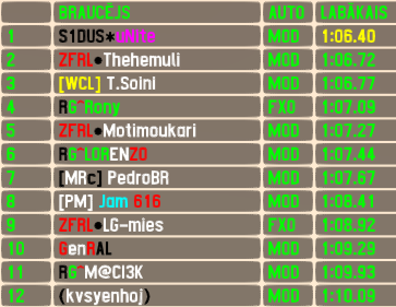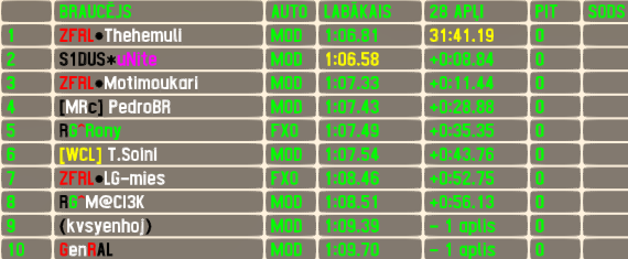 4 weeks after his 1st RandomCar podium finish,Thehemuli added a race win to his achievements - already in lap one he used the polesitters mistake to challenge for lead and since the polesitter made even bigger mistake in next turn,he was in large lead right away,led all 28 race laps to finish first with 8 seconds lead. The finn scored the 1st race win for the Imprezzive B2 and 3rd win in row for all-wheel-driven cars. Despite the early mistake and finding himself on the tale end of the field right after it,Unite still proved he is the fastest on track with his Piran Firefly as he set the fastest laptimes in both sessions,but had to settle for 2nd place finish - still his best result in this league,improving from 10th place finish in round 6. Motimoukari brought his Ultimate Road Car home in 3rd position,which is his 1st top10 finish in this league.