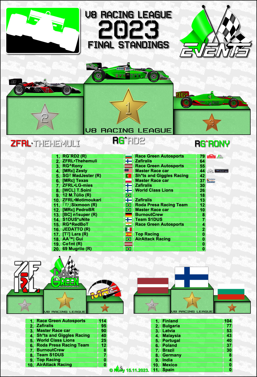The hosting team is the 2nd team,which was able to defend the title - first was Team S1dus in years 2020-2021. RGA started the season from 4th position after season opener,took over the lead already after the low points scoring shortened round 3 and did not allow the rivals close up anymore. Despite having a 2 race winner in their lineup,only a single race win has been scored for RGA (RD2 started the season as indipendent racer) and 8 top5 finishes.