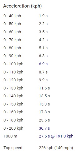 after doing more research for this car top speed with electric limiter is about 190km i also find acceleration data and top speed with car unlocked (no electric limiter) its no more then 226km / 140mph , i also tested the car in game top speed and your right it does go a lot more then what it should be i manage to get 260km on stock setup and oem gear ratios, so i will consider updating the car giving it little more drag it may not going to be perfect but there has to be a sweet spot that we all agree on.