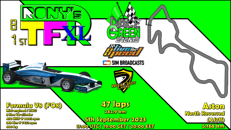 The V8 Racing League week was opened early - on the tuesday the RTFR XL run the old VERL car,but on sunday the new one will also have it's turn,running a big part of the same track as on tuesday,VERL will start it's 9th season with it's first ever race at Aston's longest configuration. If you're interested in the challenge the 600 horsepower car offers,make sure not to miss the action - full information and signups in V8 Racing League forum section! Next week in normal RTFR there will be a relativelly simple road car on the menu,full information will be posted on the weekend,while the RTFR server will be used for other series in 2 weeks time - the colorful field of RandomCar will be run on a custom configuration in Kyoto. The honors of selecting next combo for RTFR XL went as low as for 3rd place finisher as top2 both have already reached the 3 selections per year limit,he however has not submitted his choice yet.