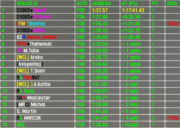 [FM]ˆOhnifus - receives 20 seconds penalty added to his finish time for pit exit line violation on 2 occasions.