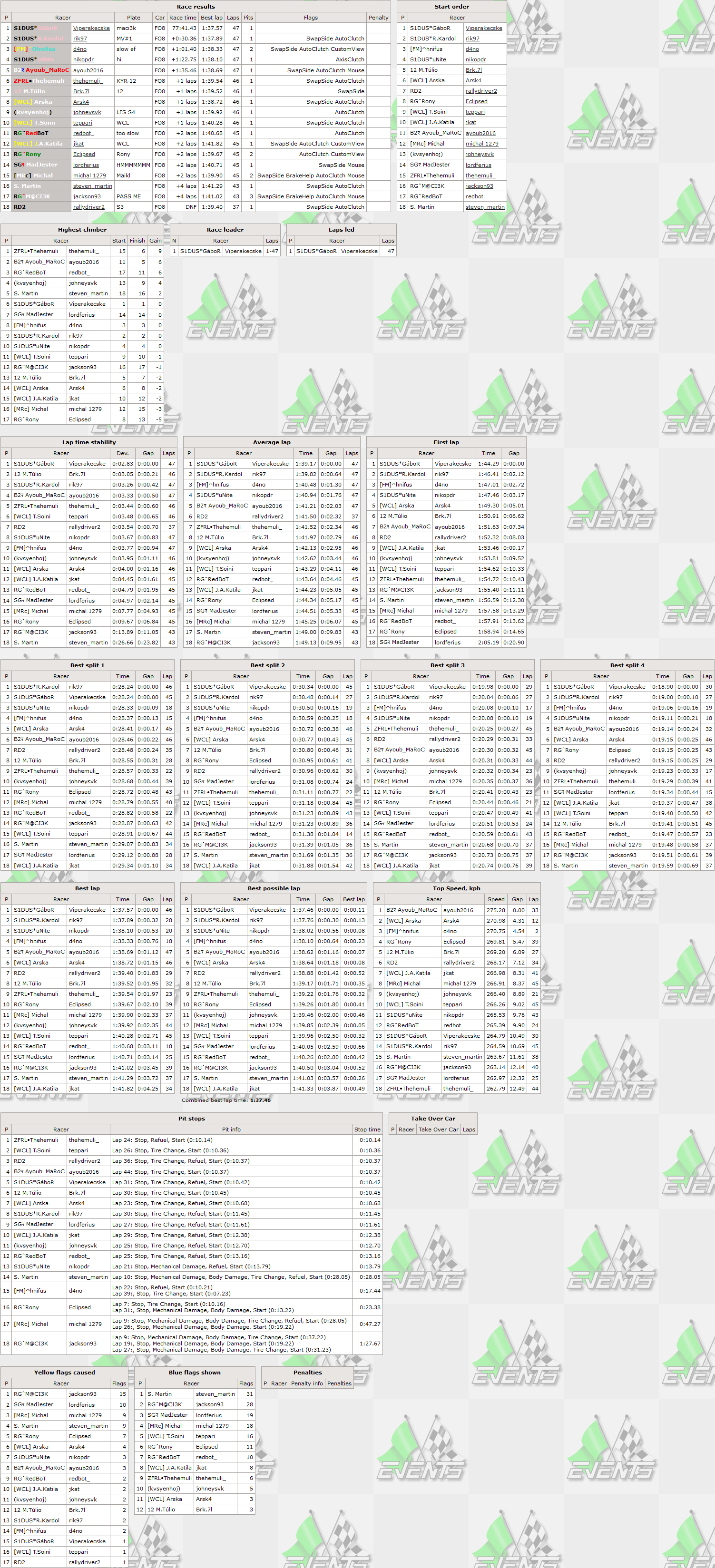 For the 2nd time in RTFR XL history a car track combo was repeated - 51st RTFR XL combo was a repeat of 19th (XRR at AS5),this week it was a repeat of 41st RTFR XL. Of course it draws the wish to compare results - winner of previous race required more than 2 minutes longer to complete the same distance,however he required an extra pitstop back then and the competition was quite lower - all 5 finishers on lead lap this week completed the distance faster than winner of previous race. Another improvement is attendance and finishing percentage - total attendance improved by 7 and all 18 starters completed the 50% distance requirement to be scored in results.