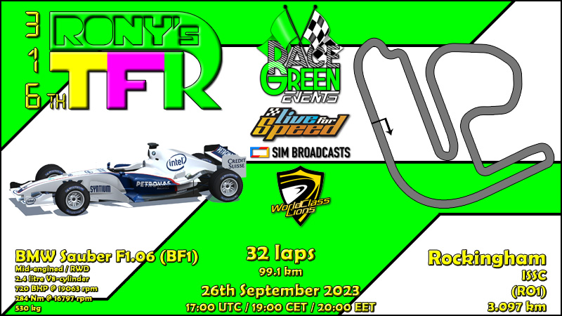 Even if has traction control,wide grippy tyres and plenty of downforce,LFS's fastest standard car is still a lot of challenge to everyone - the 2006 BMW Sauber formula one car has 720 horsepower coupled with dry weight just over half a ton. That helps it to reach high speeds quickly and go through turns faster than any other car in the cars list,demanding from drivers fast reflexes and mental endurance also for just a 30 minutes race. In the only real world track of our beloved racing simulator formula one cars have been run just for show purposes as none of the configurations is deemed to suit the highest class racecars,this is where the simulator jumps in - to answer some "what if..." questions and this tuesday we answered a question "what if Rockingham's 3.1 kilometer long ISSC configuration would have been part of F1 2006 schedule?"