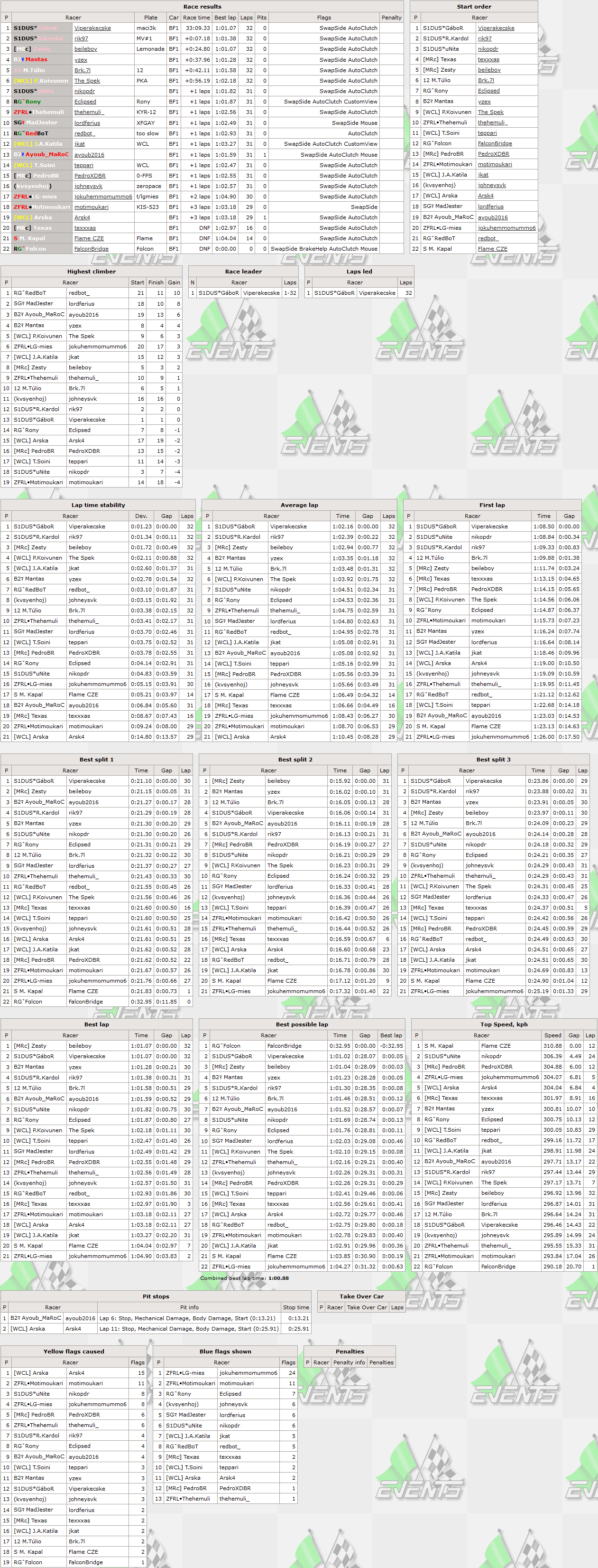 The distance was just 1/3 of a normal grand prix distance,so we cannot give you a full answer,but the winner of this race would surely describe it as "traffic rich race" - Gábor lapped all but 5 rivals in the short race on his flag to flag ride in the lead to the victory lane. Luckily the damage is not simulated fully realistic,so he could finish with minor damage from few contacts - the hungarian was able to win the 5th race from past 7 races and 26th race overall,scoring also 52nd top5 finish,19th pole position and 21st fastest lap of the race,the latter was also 30th for Hungary. Gábor's only actual rival was his teammate R.Kardol,who was the only other driver to beat the 1 minute mark in qualifying and finished "just" 7 seconds off lead to score his 80th top5 finish. There was another driver to be kind of "on par" with the race winner - Zesty tied Gábor's fastest lap of the race on the final lap to score his 1st ever fastest lap,while also improving his previous best finishing position by one as he finished third,adding 4th top5 finish to his achievements. The winner of previous RTFR race finished 4th this week to take 3rd top5 finish in row and 11th overall,while M.Túlio closed the top5 in his 2nd RTFR attendance,improving finishing position massivelly from his previous attempt,which was 19th place finish 4 weeks ago.