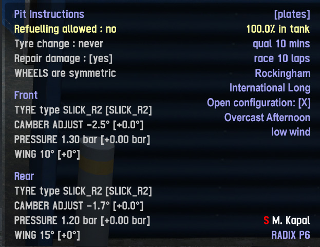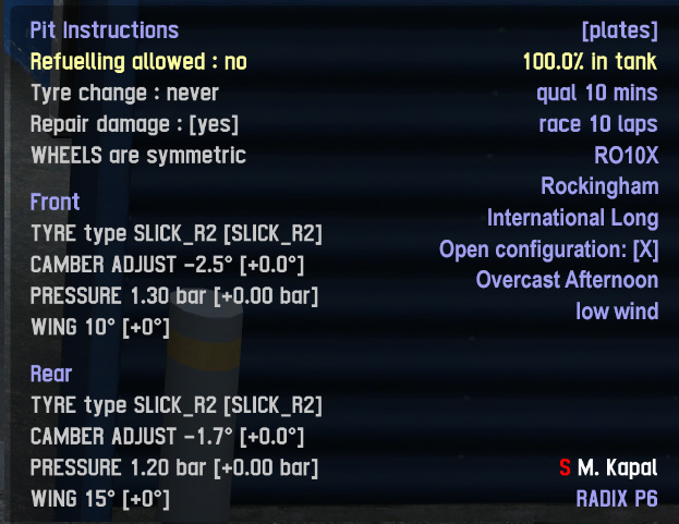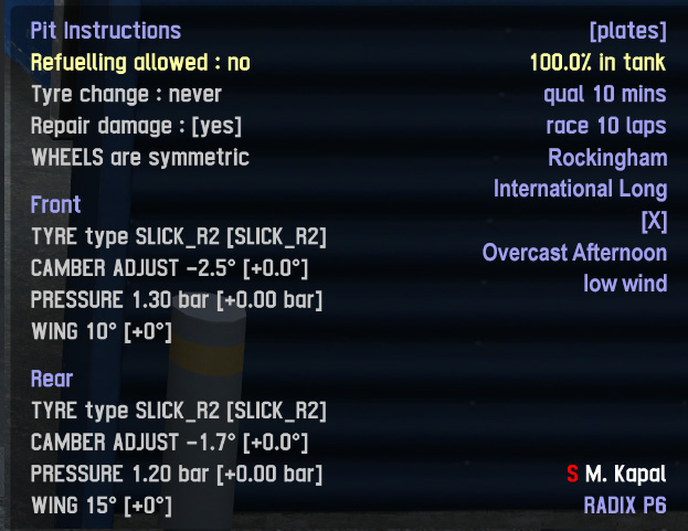 Pit instructions are on the left side. The right side already shows the current setup, info about race/qualifying length, the driver name and car, so I thought why not use it for track info too.