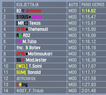 The race went on with 8 drivers taking the grid, Texas sitting on pole with Thehemuli beside him on the front row. Texas got off to a good start and was leading comfortably until lap 11 where he went off in the last turn, losing his lead to Thehemuli and now having RD2 right up his rear bumper. The trio of cars were closely togehter for the rest of the race, with Texas regaining the lead on lap 28 after a nice move in the long left hander. He then seemed to pull away towards an easy victory until disaster struck on the final lap. The polesitter had miscalculated his fuel and ran out of juice on the middle sector, leaving him stranded. This meant the win was going to be fought between Thehemuli and RD2 who were closely together. RD2 made a heroic lunge up the inside into the final corner of the race and made it stick, pulling away to take the first ever win in a Zafiralis hosted event by only eight hundreds of a second over Thehemuli. Podium was completed by the creator of this awesome car Motimoukari who had been playing cat and mouse with MadJester throughout the race. MadJester and T. Soini completed the top 5, and his close rival for most of the race distance, Donald finished 6th ahead of unlucky Texas who was the last to finish after receiving a tow.