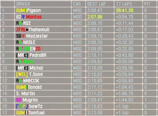 GUM|||Piegon took the seat of the pole sitter, the battle for the first laps with B2R Mantas was intense but after a mistake from the latter he led the next 14 undisputedly. As many drivers realized this car has very little grip when pushed to the limit, the consistency and race craft displayed made Piegon the gold medallist of this race, a great drive.