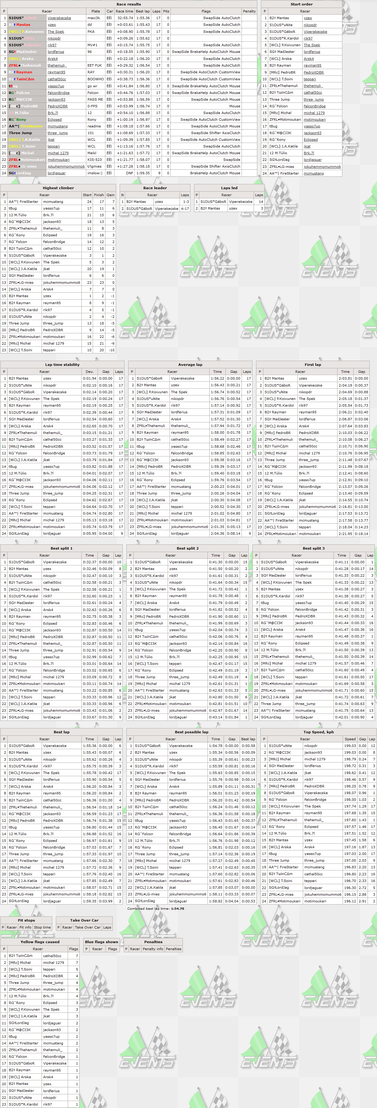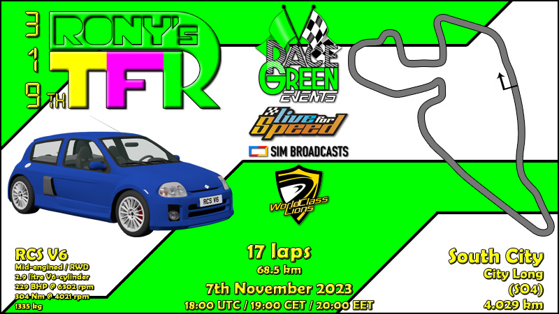 Size similar to XFR,weight similar to FZ5,drivetrain configuration of RAC - these are the key features of the car used in RTFR yesterday,which is a beefed up version of a compact car to make a track day car while keeping it road legal. That resulted in a slight mixup between drivers - some had more struggle with the car,some were able to adapt to it right away. There is one statistic that was almost repeated from 315th RTFR - the same number of drivers qualified,started and finished (or at least completed full 50% to get classified) the race,but unlike 8 weeks ago,these were exactly the same drivers and the count was 3 lower,still setting all time 2nd best finishing percentage - 100% with 24 drivers.