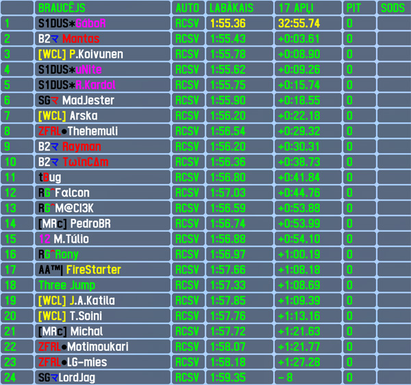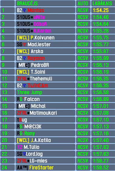 During qualifying also the 15 race rating and current season standings leader Gábor had some struggles before finding the pace to qualify 3rd,but it took just 4 laps for him to improve his position to the leading one - by crossing the finish line first,the hungarian started his 5th winning streak in RTFR. Gábor scored his 28th RTFR race win,24th fastest lap of the race and 54th top5 finish. Mantas was one of those who found common language with the car very early and led standings of the qualifying session since his 1st proper lap to score his 2nd pole position and 40th pole position for Lithuania. However during the race he had problems with overall pace and had to concede the race lead,finishing 2nd with over 3 seconds gap to winner - that's his 12th top5 finish. P.Koivunen finished 3rd,scoring his best result in RTFR this year,breaking his 3-race 6th place finishing streak - 1st top5 in this scored season,6th overall for the finn. He was closelly folloved by 2 teammates of the winner - Unite finished 4th,scoring his 75th top5 finish,R.Kardol closed the top5 to take home the 83rd top5 finish.