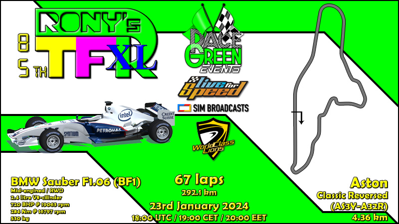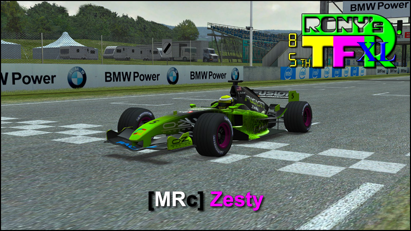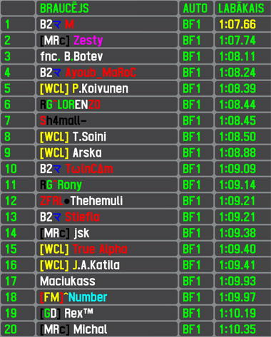The new year of RTFR XL was started with the fastest original LFS car - the BMW Sauber F1. Despite high drag from it's wings,it still easilly passes the 300km/h mark. Also it's the quickest in terms of drying out it's fuel tank - that made differences in strategies for the race as some were able to complete race distance with single pitstop,some needed 2,but some decided to hit walls and go for more than 2 pitstops. The combination of all these factors made the race completelly unpredictible when watching from aside as few drivers early on top positions finished way below their expectations while some from behind rised up the field.