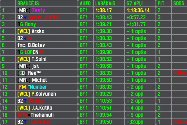 The new year of RTFR XL was started with the fastest original LFS car - the BMW Sauber F1. Despite high drag from it's wings,it still easilly passes the 300km/h mark. Also it's the quickest in terms of drying out it's fuel tank - that made differences in strategies for the race as some were able to complete race distance with single pitstop,some needed 2,but some decided to hit walls and go for more than 2 pitstops. The combination of all these factors made the race completelly unpredictible when watching from aside as few drivers early on top positions finished way below their expectations while some from behind rised up the field.