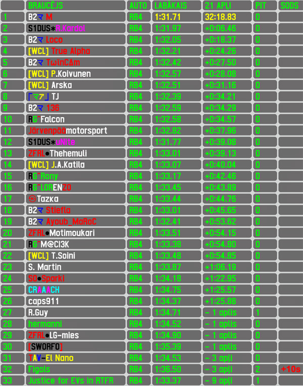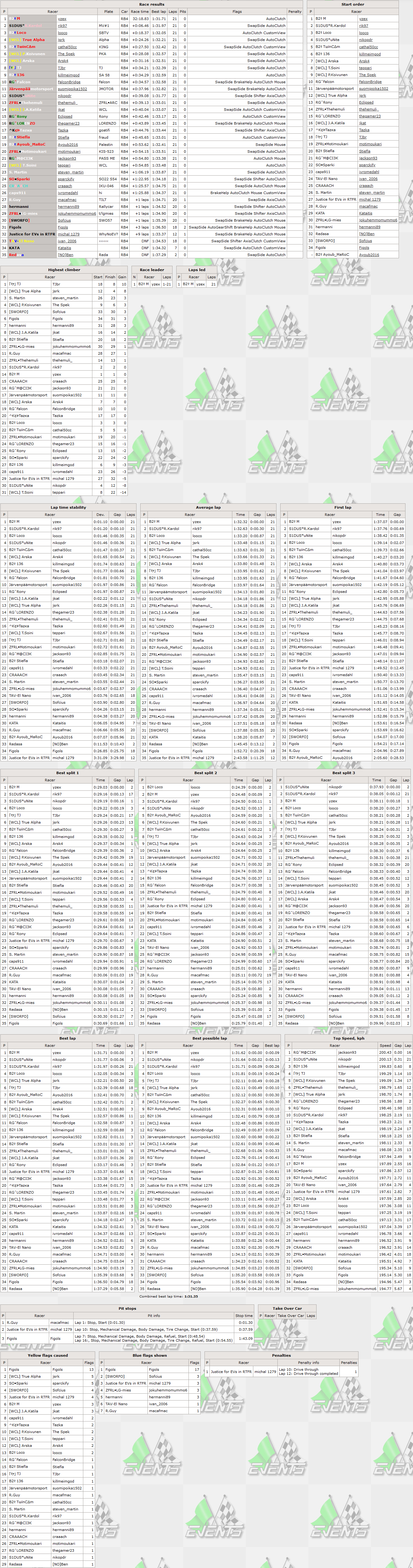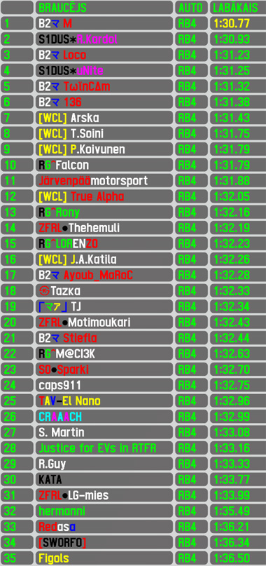 Just like 2 weeks ago,driver with a single letter in his name led all the laps of the race - M once again dominated the event,allthough not in absolute domination fashion - he was just 0.16 seconds faster in qualifying and finished with over 6 seconds gap over competition. The lithunian is the 25th driver in RTFR history,who has scored at least 4 race wins,while his pole position was also his 4th,addionally scoring his 3rd fastest lap of the race and 15th top5 finish. The 2nd place in current season standings (despite finishing just 3rd in 1st race) will keep the position also after this round - R.Kardol was the 2nd best in the latest race,scoring record breaking 87th top5 finish,taking over sole lead in this chart. Another lithuanian finished 3rd - Loco's previous best results in both sessions were 7th position in 4 started and finished races,yesterday he improved both of these to 3rd position. 4th was True Alpha,who started from 12th position,he did a lot of overtaking to score his 23rd top5 finish,top5 was closed by 3rd B2R driver in yesterdays top positions - Twincam scored his 5th top5 finish.