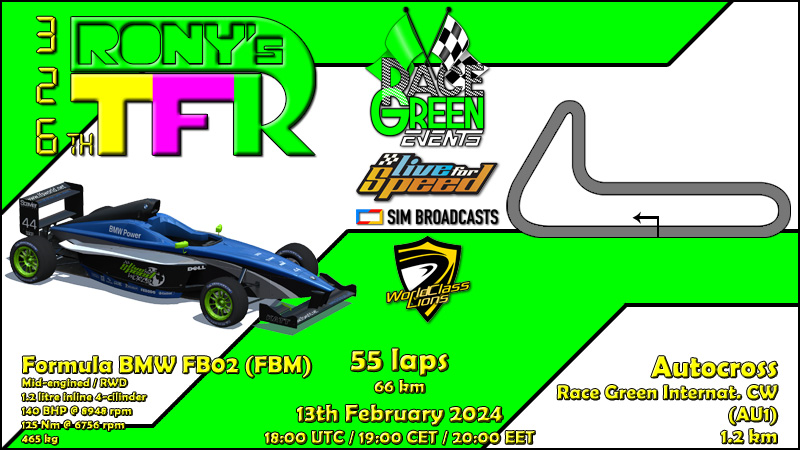 Next week it's turn for the longer RTFR version - the 86th RTFR XL will be run in Westhill International reversed with the PROTECH 92 GT3,making the 2nd appearance of a GT3 car between both RTFR versions this year. The previous try with other GT3 car made itself badly famous so next week can only be better,additionally racers should be more conservative in first laps as the race is more than twice as long. In 2 weeks normal version of RTFR will return with a slower car on longer circuit - which and where you can find out when watching broadcast recording of this race. But the next RGE race is already this sunday - AWS season is closing to it's deciding phase,everyone is welcome to be part of it,taking the challenge of Westhill Street Cup,where RB4 will be raced on a custom support roads based track in Westhill - info and signups in AWS forum thread.