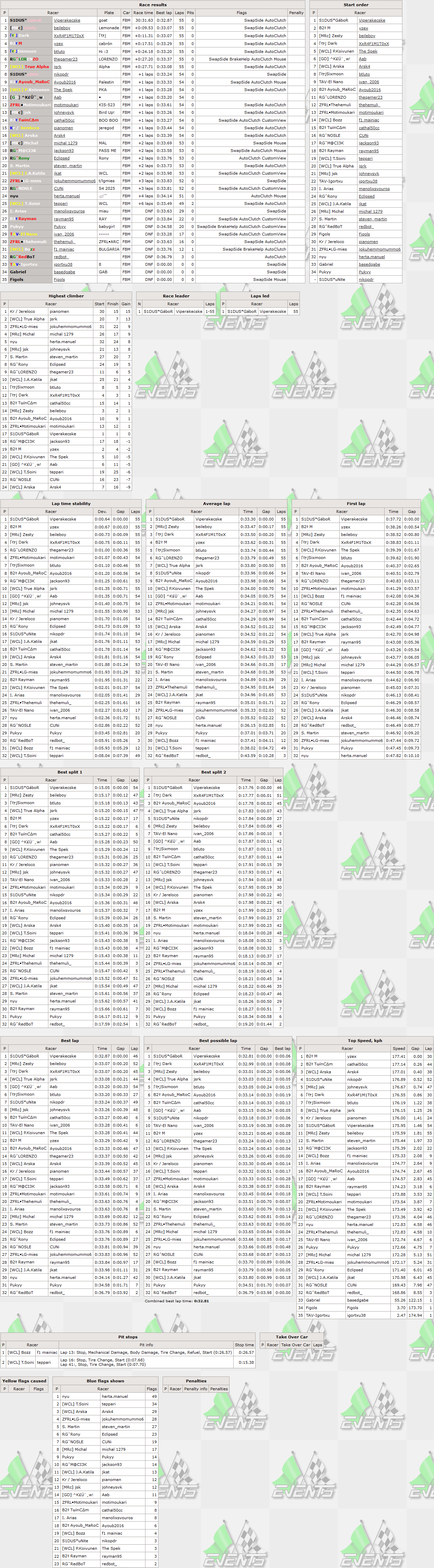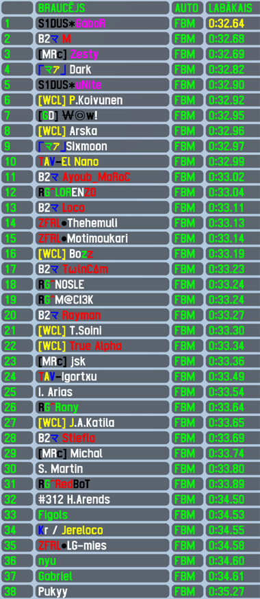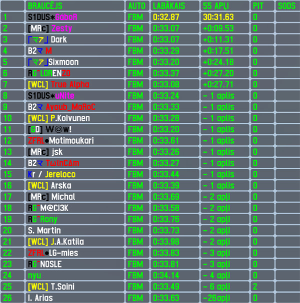 After winning 4 races in row Gábor retired from the chance to win the 5th one and took 3 race break from RTFR,yesterday he returned and scored yet another clean sweep - the pole position was his 24th,in race he led all 55 laps to break the 600 laps led mark all time in RTFR (still 2nd most),the fastest lap of the race was his 27th,the race win started his 4th decade of wins as it was his 31st and additionally he scored his 57th top5. The winner of the latest RTFR XL race Zesty finished 2nd with just over 1/4 of track length gap to race winner,scoring his 7th top5 finish - the 3rd place in qualifying was a repeat of his previous best performance. Dark made his 2nd RTFR appearance,improving his previous qualifying position by 1 position and also finished an RTFR race for the 1st time by taking the lowest step on the virtual podium. M had no arguments in this race to keep his winning streak alive - despite starting from front row,he could not keep up the pace through the intense race and finished 17 seconds (effectivelly more than half a lap) behind winner in 4th position to score his 16th top5 finish. Another brazilian closed the top5 - Sixmoon made his RTFR debuth and could celebrate it with a top5 finish.