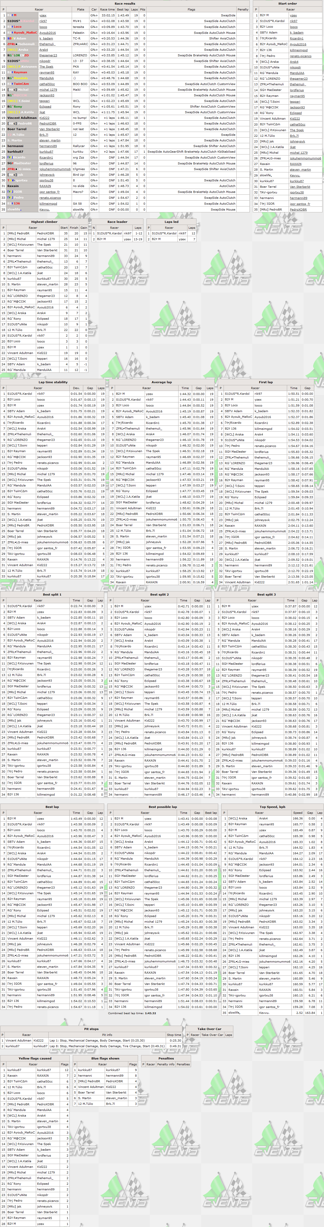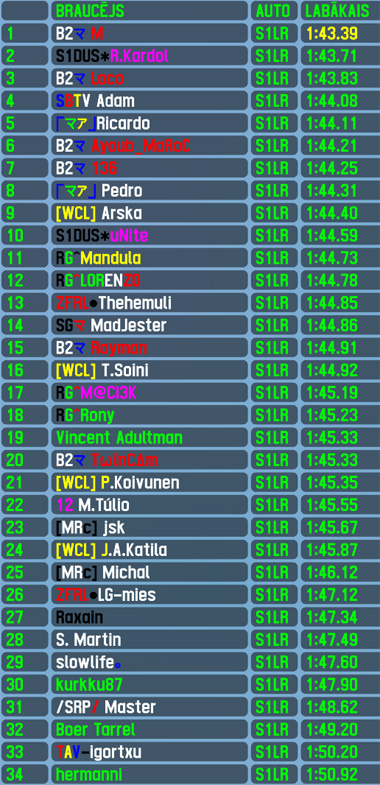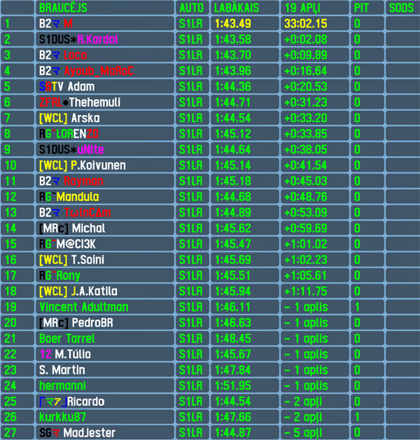 Winner of 2 out of 3 RTFR 2024 season 1 races M made it 3 out of 4 - he had a setback on lap 1 as he lost the lead to fellow front row starter,however he recovered and after few tries finally returned to race lead for the last 7 laps of 19 to cross finish line first once again. That was the lithuanian's 5th RTFR race win - he is the 23rd driver in event's history to score 5 or more,five is also his pole positions count after this race,while the fastest lap of the race is his 4th and top5 finish - his 17th. Additionally he rounded up fastest laps count for Lithuania to 30 (4th most between all countries). The defending standings winner R.Kardol was the only one to challenge winner of this race - he led 12 laps from the start until losing lead,at the end he had to settle for 2nd place finish with 2 seconds gap,which is his 88th top5 finish. Another B2R member Loco took the remaining position on the virtual podium - 3rd in both sessions is a repeat of his personal best achievements. To make 3 out of 4 best consisting of B2R members,Ayoub Maroc finished 4th,which is his 14th top5 finish,top5 was closed by Adam scoring his 5th top5 finish,while his 4th place in qualifying was an improvement by a single position compared to his previous best result.