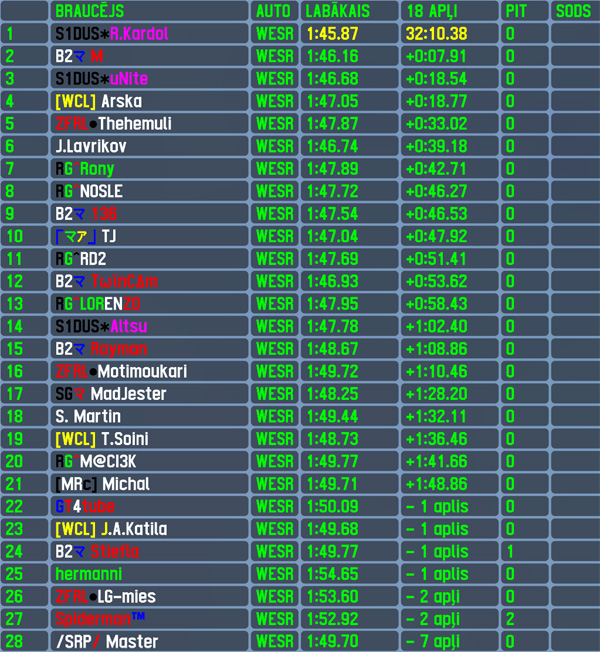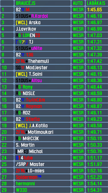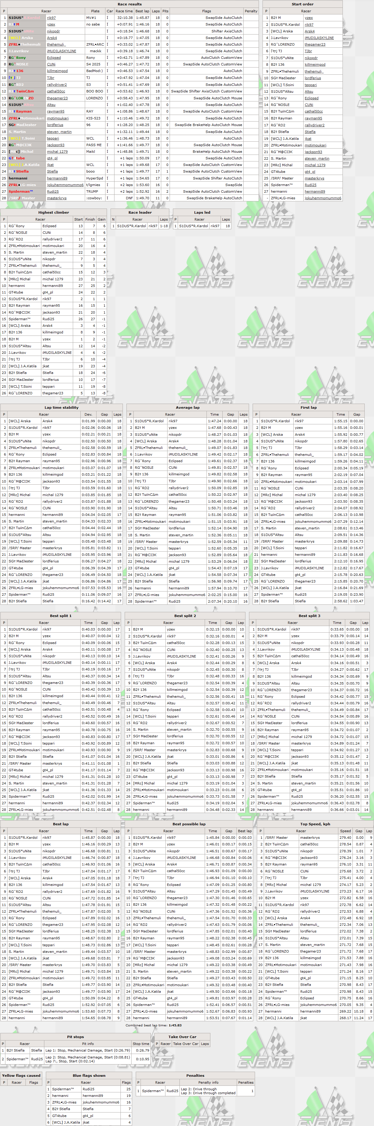 Same car,same winner - R.Kardol celebrated race win back then in XL with this car,so he was kinda bound to repeat it. The dutchman qualified 2nd and from outside of front row he eventually took race lead on lap 1 and kept it after some struggles with competition early on. Despite not beating the 1:46 mark in qualifying,he was the only one to crack it during the race - that's his 15th fastest lap of the race,but more important - the 21st race win in RTFR,while he rounded up the top5 count to 90. The driver of the season M was the fastest in qualifying to score his 6th pole position (4th this year alone),but he lacked the consistency in the race,having to recover at least a 2nd place finish,taking the 6th top5 finish out of 6 races this season,19th top5 finish overall. The finnish duel for 3rd position was won by Unite,barely beating his countryman over the finish line - that's 78th top5 finish for him. Arska had to settle for 4th place finish,improving his season's best by a position,27th top5 overall for him. Top5 was closed by someone who also improved his season't best by a single position - Thehemuli finished 5th already more than half a minute apart winner,scoring his 8th top5 finish from 75 overall finishes.
