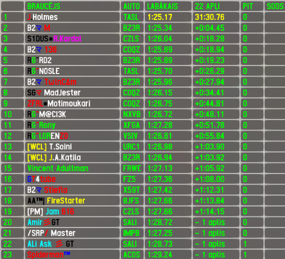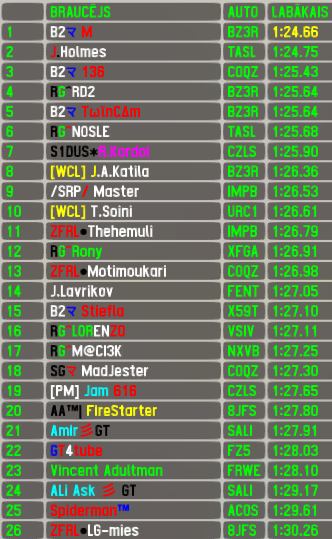 Both most drawn cars Talot and Imprezzive B2 got same amount of draws also for this round,so they stay in lead with 34 draws a piece. With 4 draws BZ30 tied URC1 for 2nd most draws - 32. Additionally there were plenty of best position improvements for cars - the most impressive one was the 1st ever pole position for BZ30 (previous best was 2nd position),while his 2nd place finish was just a repeat. R.Kardol scored the 1st podium finish for CZR,which was also improvement by a single position. 136 improved both qualifying and finishing best results for Coquette - 3rd position in qualifying is 2 positions better than previous best achievement,while his 4th place finish is just one position better. Only 2 drivers have ever driven the XF Garis - Rony improved his own set best results in both sessions,12th position in qualifying is improvement by 2 while 11th position in race is 8 positions better. The league debutant J.Lavrikov received Fend Torus base model for his 1st appearance,his 14th position in qualifying is an improvement by 6 positions. Lorenzo is the only driver who raced a new car and set first achievements for it - 16th in qualifying and 12th in race.