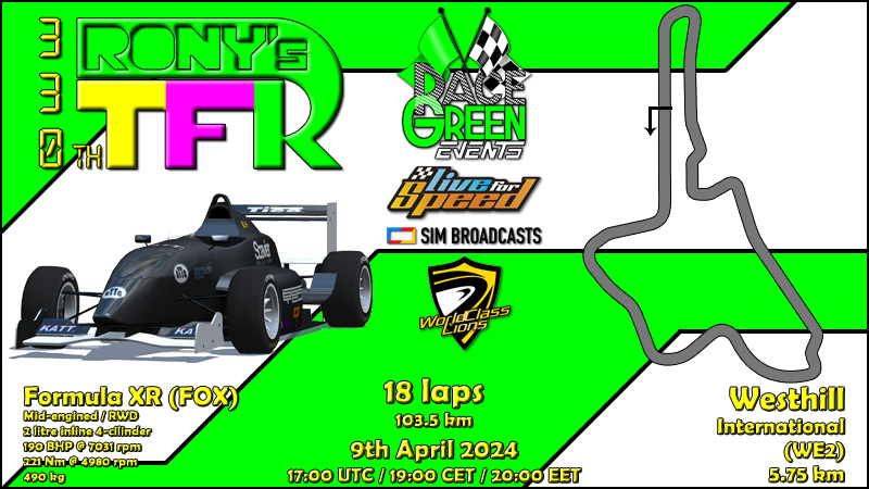 The Formula XR,better known under it's abbreviation "FOX" is the most online used car of LFS besides all three demo cars,gaining it's popularity from it's rather low difficulty and relativelly high pace. The car run in Westhill's International configuration is considered quite a classic - there was even a throwback race few years ago in an older LFS version where International was still the only configuration of Westhill. During all these years and over 300 races this classic combo was never used in RTFR,this week we finally filled this gap with a typical 30+ minutes race with FOX in Westhill International. A total of 34 drivers were atracted to this event,one of them did not start,however all 33 starters completed the 50% distance requirement to be counted as finished,therefor setting a new RTFR finishing record - 100% with 33 finishers,beating 2 weeks ago set record of 100% with 28 finishers.