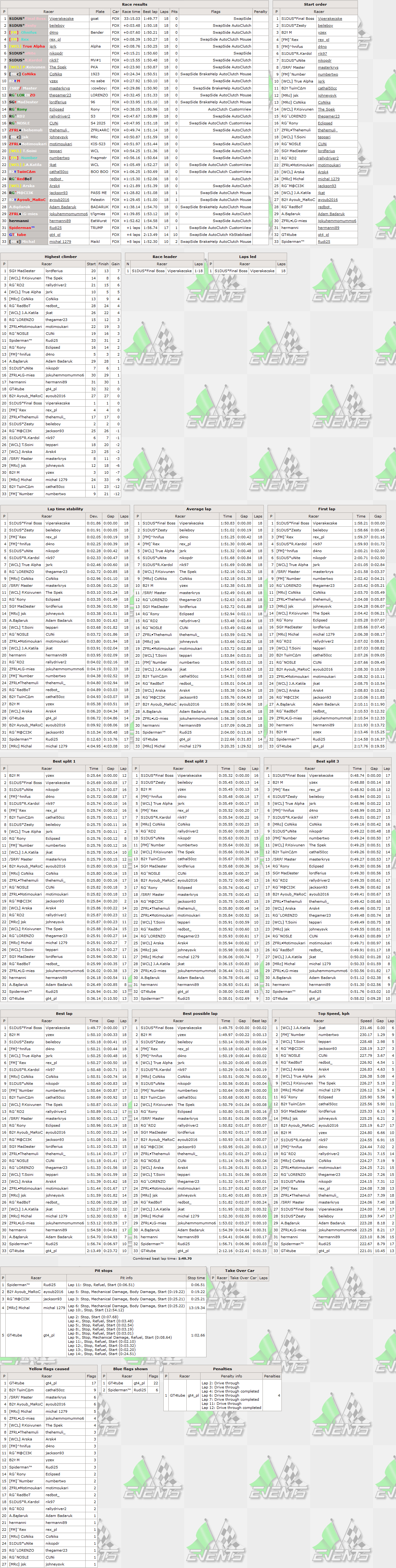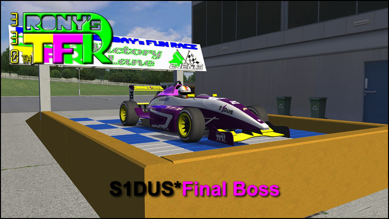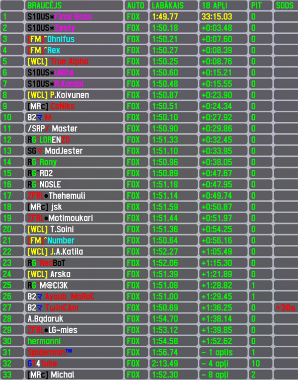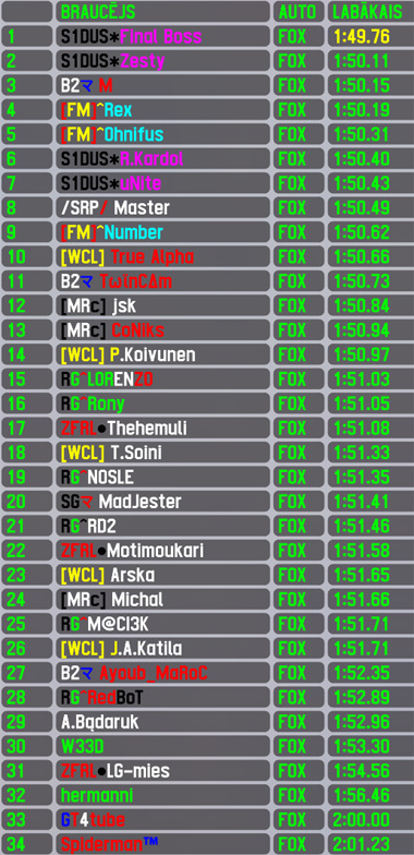 As usually having an official world record is a prerequisite of success also in online race. A racer previously known as Gábor under other name joined RTFR after missing 3 events and took another full set of achievements this tuesday. In both sessions mr F.Boss was the only one to beat 1:50 minutes laptime mark,scoring his 25th pole position and record tying 28th fastest lap of the race. Even if the 3 seconds gap over the finish line does not sound so convincing,the hungarian led all 18 laps (tying Botsi also for most races led at 39 a piece) to finish ahead of everyone else to score his 32nd RTFR race win and 58th top5 finish. His rather new teammate Zesty scored his best ever qualifying result - 2nd (improvement by a single position) in RTFR and kept the same position also when crossing the finish line to score his 8th top5 finish. Next 2 finishers represented the creators of FOX Junkies - Ohnifus repeated his best qualifying result and finished 3rd,scoring his 3rd top5 finish,his new teammate Rex also repeated his best qualifying result,but improved his previous best finishing result 12th to 4th place finish in his 3rd completed RTFR race. The 10th most successful driver in RTFR True Alpha completed the top5 with his 25th entry in it.
