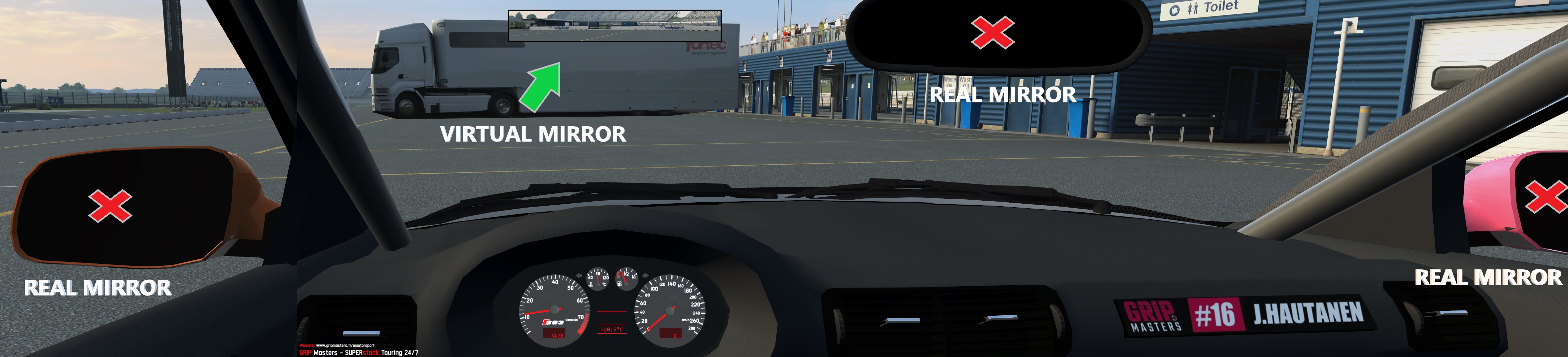 Quote from Scawen :There are some complications with allowing virtual mirror at the same time as real mirrors in the new system. Mainly because it is no longer possible for them to use the same rendered image. The central mirror is narrower than a virtual mirror and its direction depends on the head position, so it is not compatible with the virtual mirror. A virtual mirror would have to be drawn as a separate image.